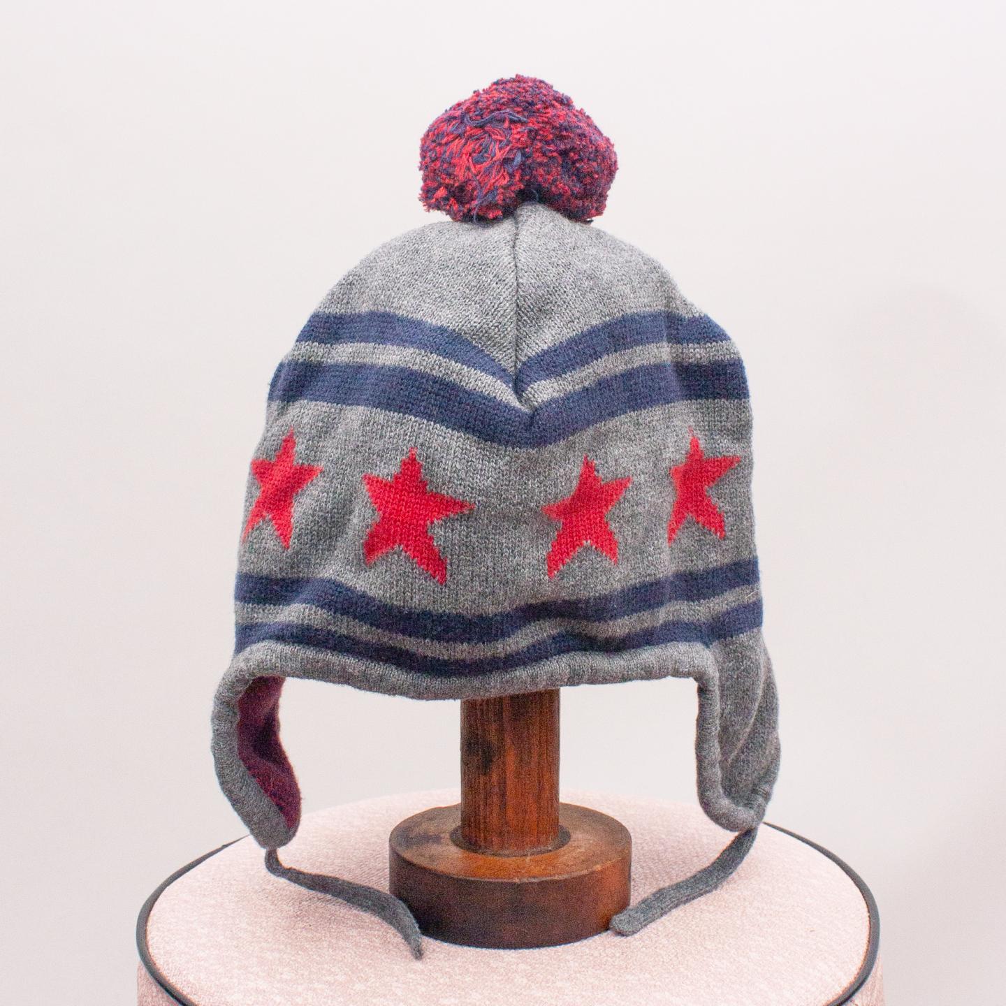 Seed grey, navy blue and red beanie with star pattern throughout, ear flaps and under chin tie - Size S/M