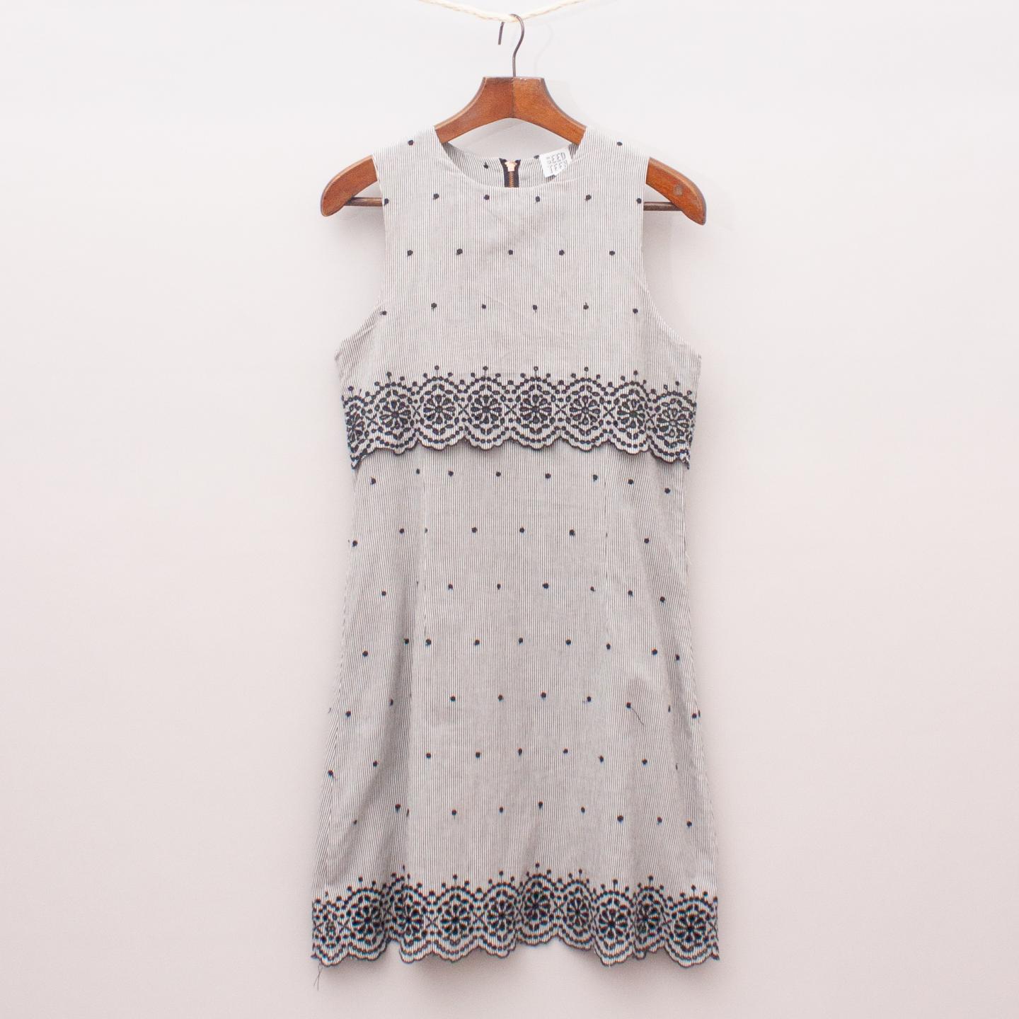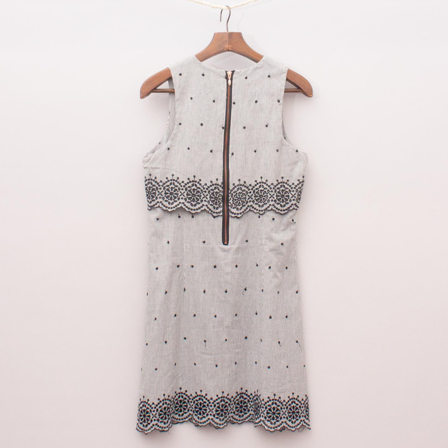 Seed black and white striped dress with embroidered polka dot pattern throughout with black broderie anglaise trim, overlay style top and zip back closure