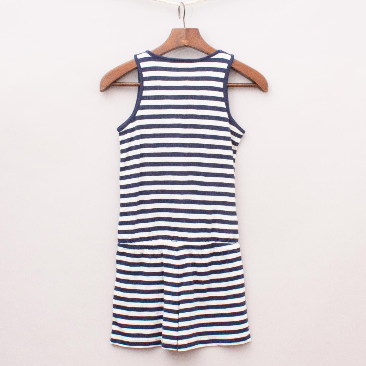 Seed blue and white striped playsuit with two front pockets, elastic waistband and button down front