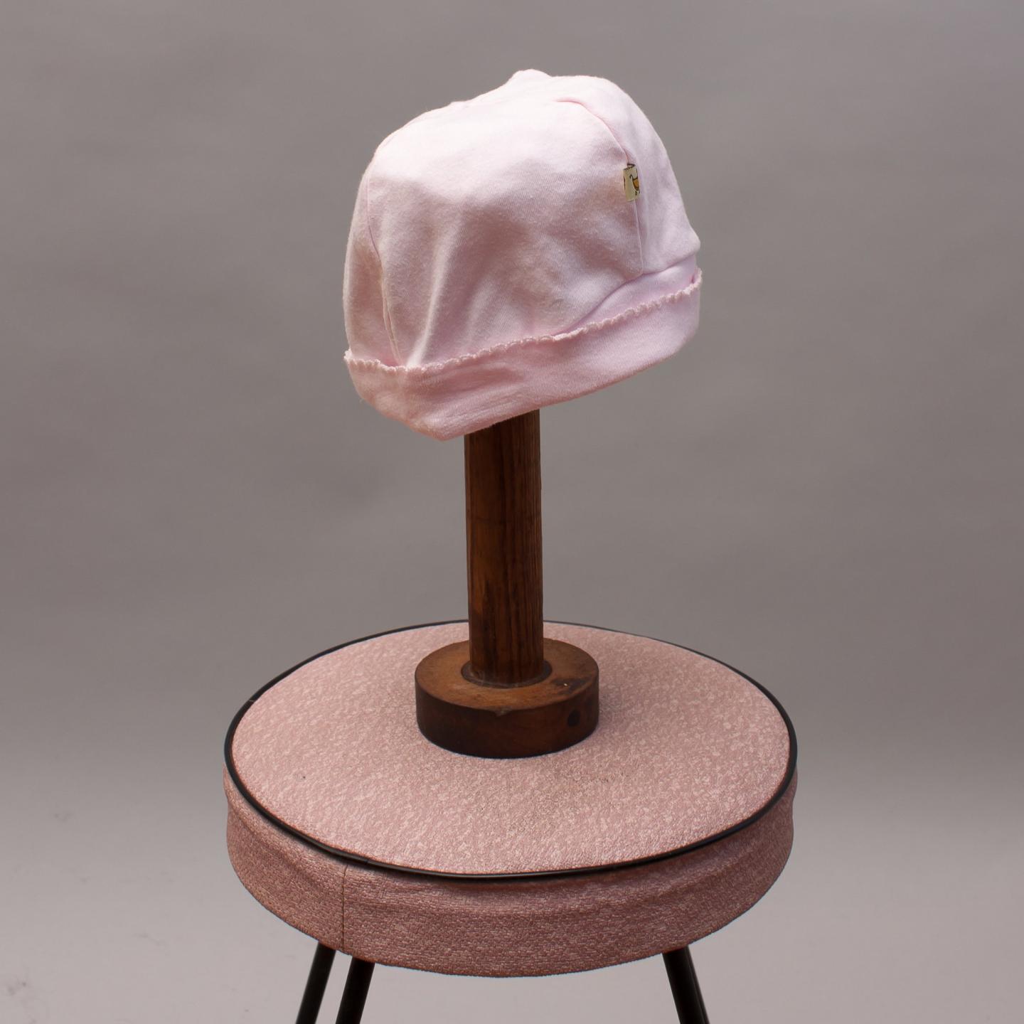 Soft pink beanie hat with rolled edge and scalloped trim detail