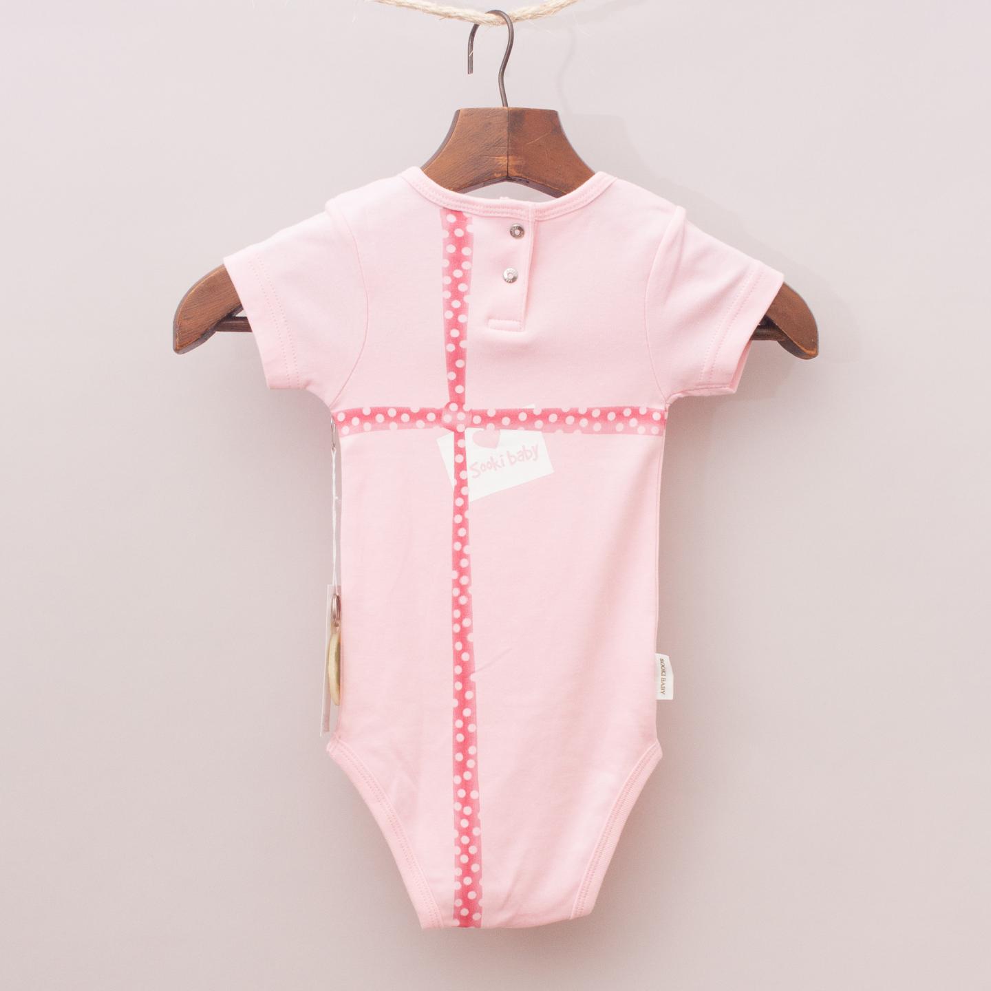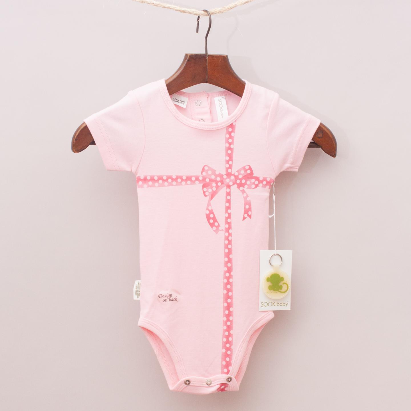 Sooki Baby "brand new with tags" pastel pink short sleeve romper with printed bow on the front and snap button closures - 100% Cotton
