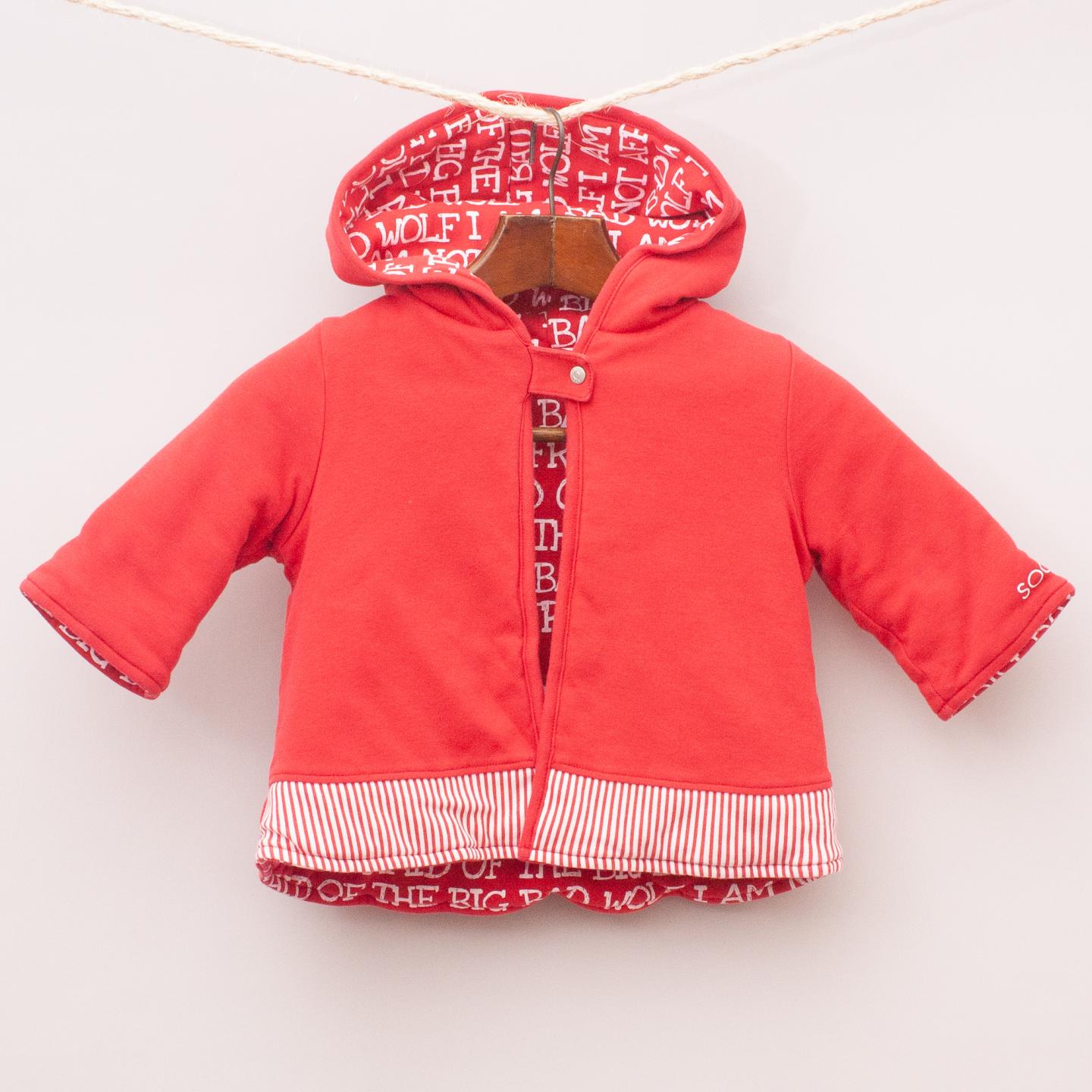 Sooki Baby red jacket with built in hood, red and white striped hemline and single button closure