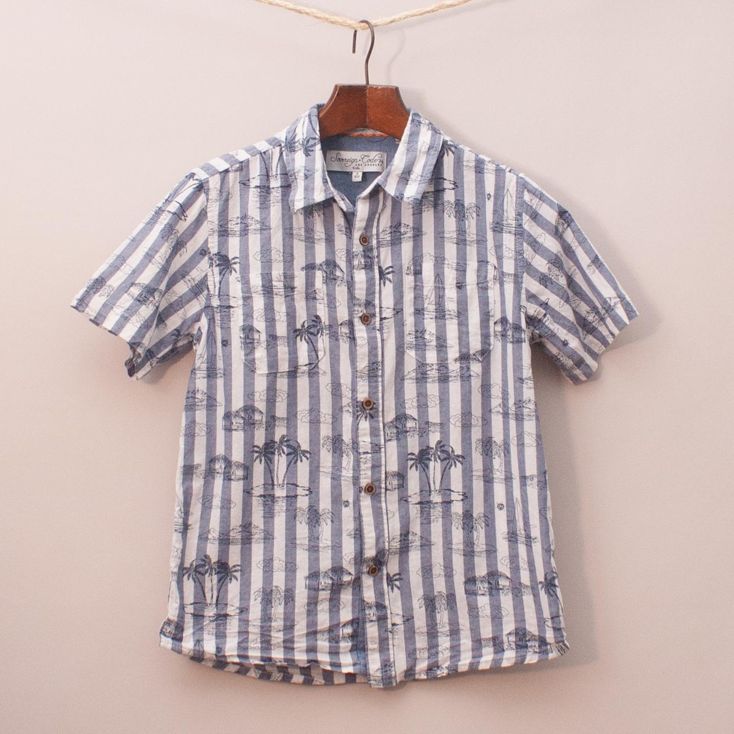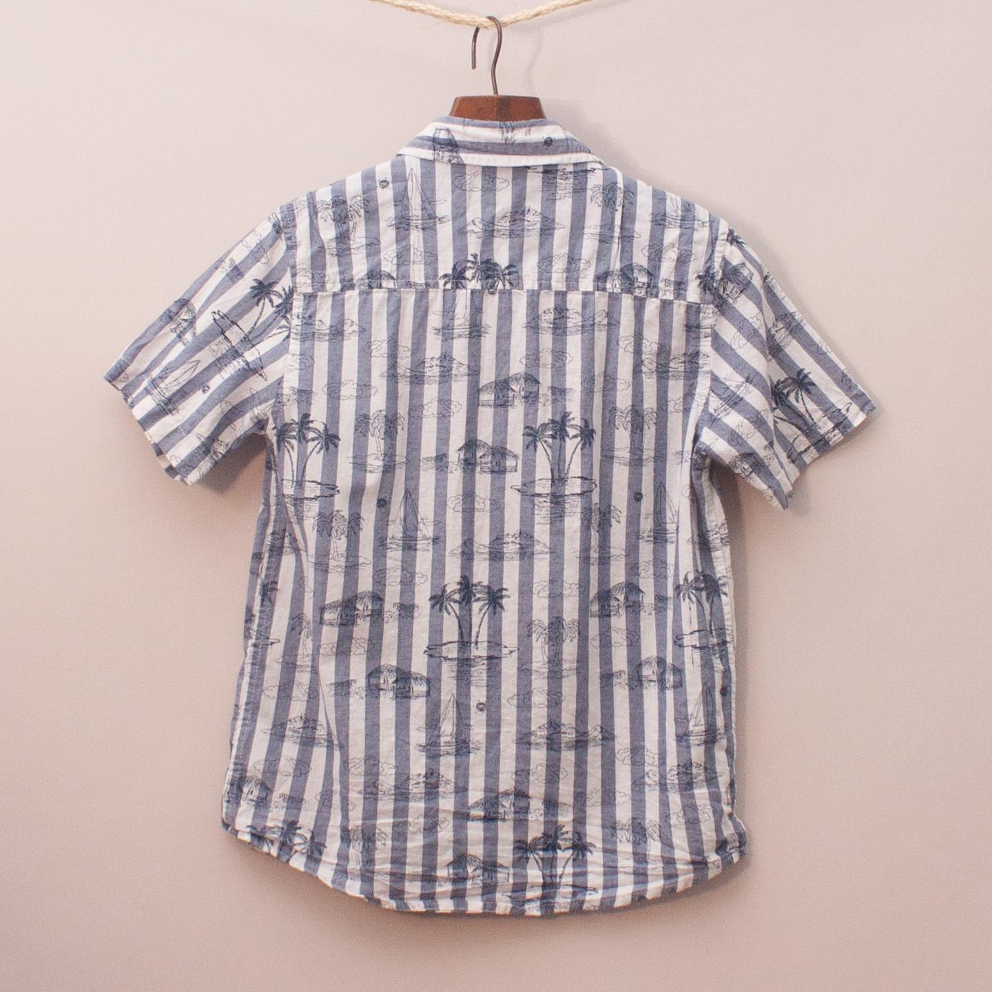 Sovereign Code blue and white striped short sleeve shirt with beach pattern throughout, two front pockets and full button down front *100% Cotton