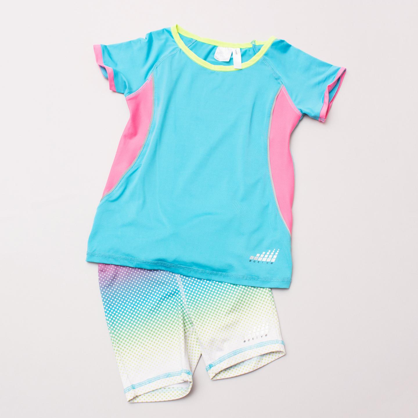 Sprint Active bright blue athletic top with hot pink and lime yellow accents, comes with matching athletic shorts with a spot pattern throughout and elastic waistband