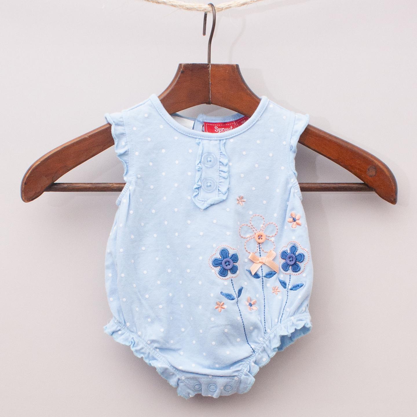 Sprout blue and white polka romper with ruffle sleeves and legs, embroidered flowers and snap button closure *95% Cotton, 5% Elastane