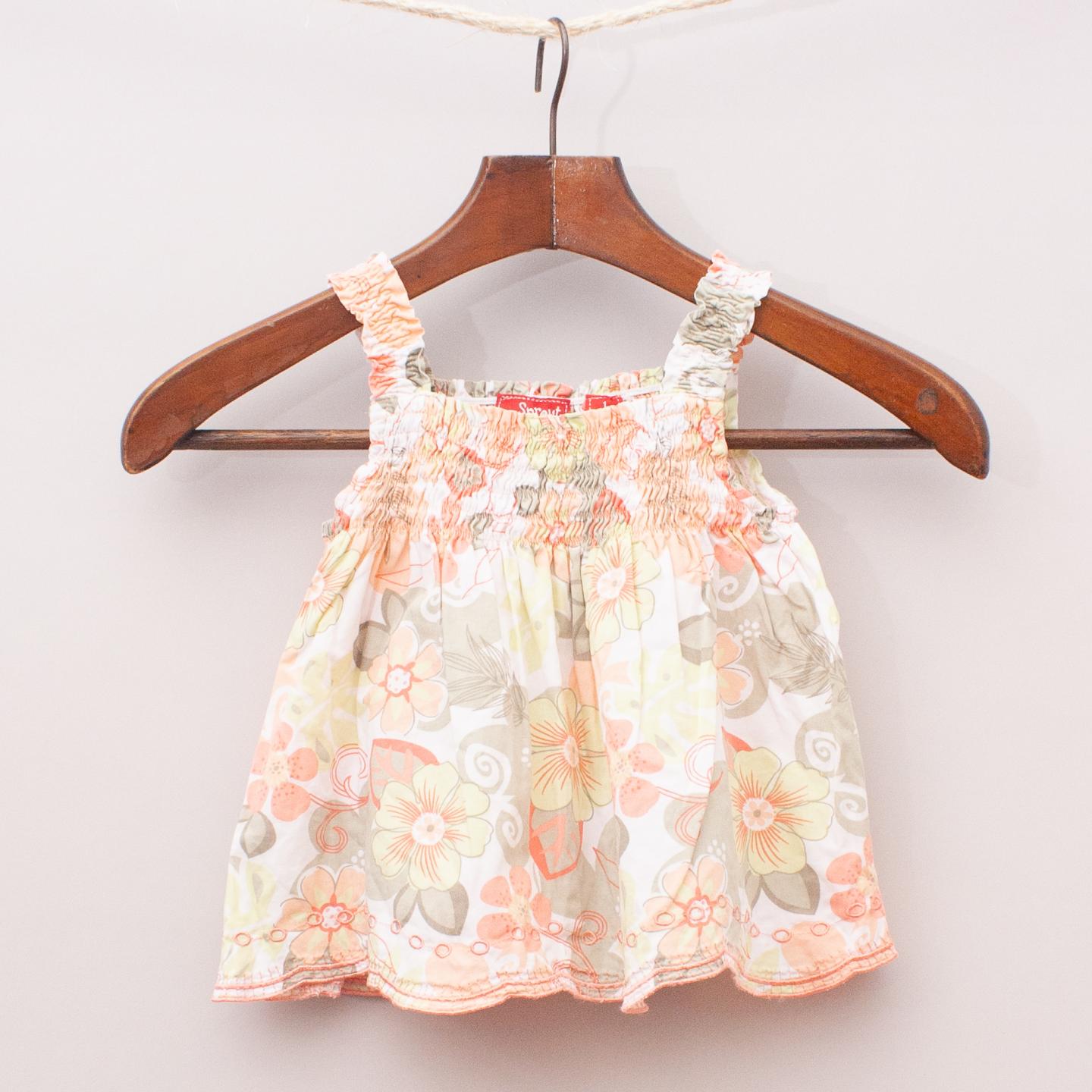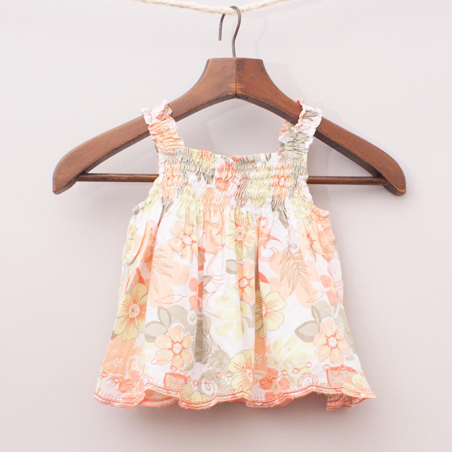 Sprout pastel yellow and green floral patterned singlet with ruched front and sleeves and embroidered hemline *100% Cotton
