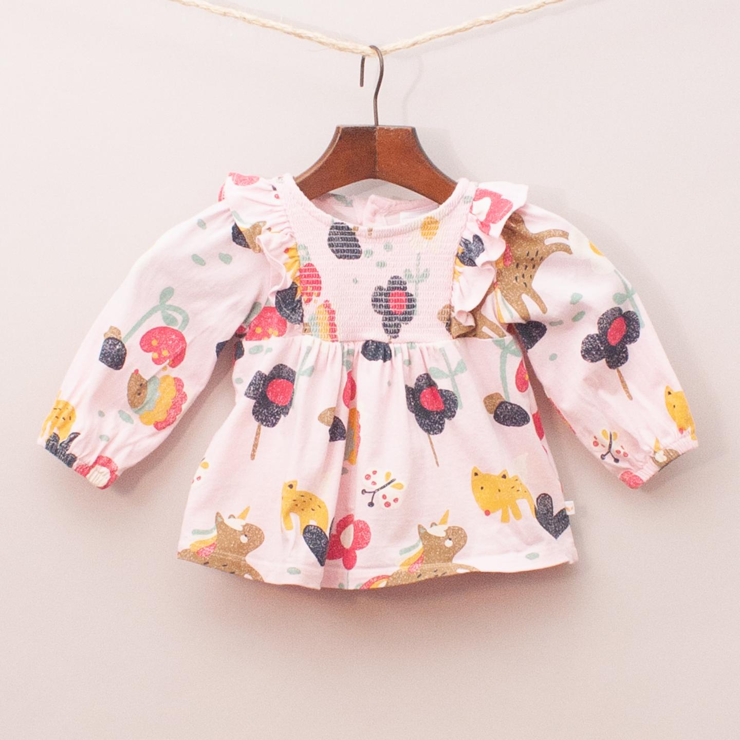 Sprout pastel pink and animal patterned long sleeve with ruched and ruffle details and full button down back closure *100% Cotton