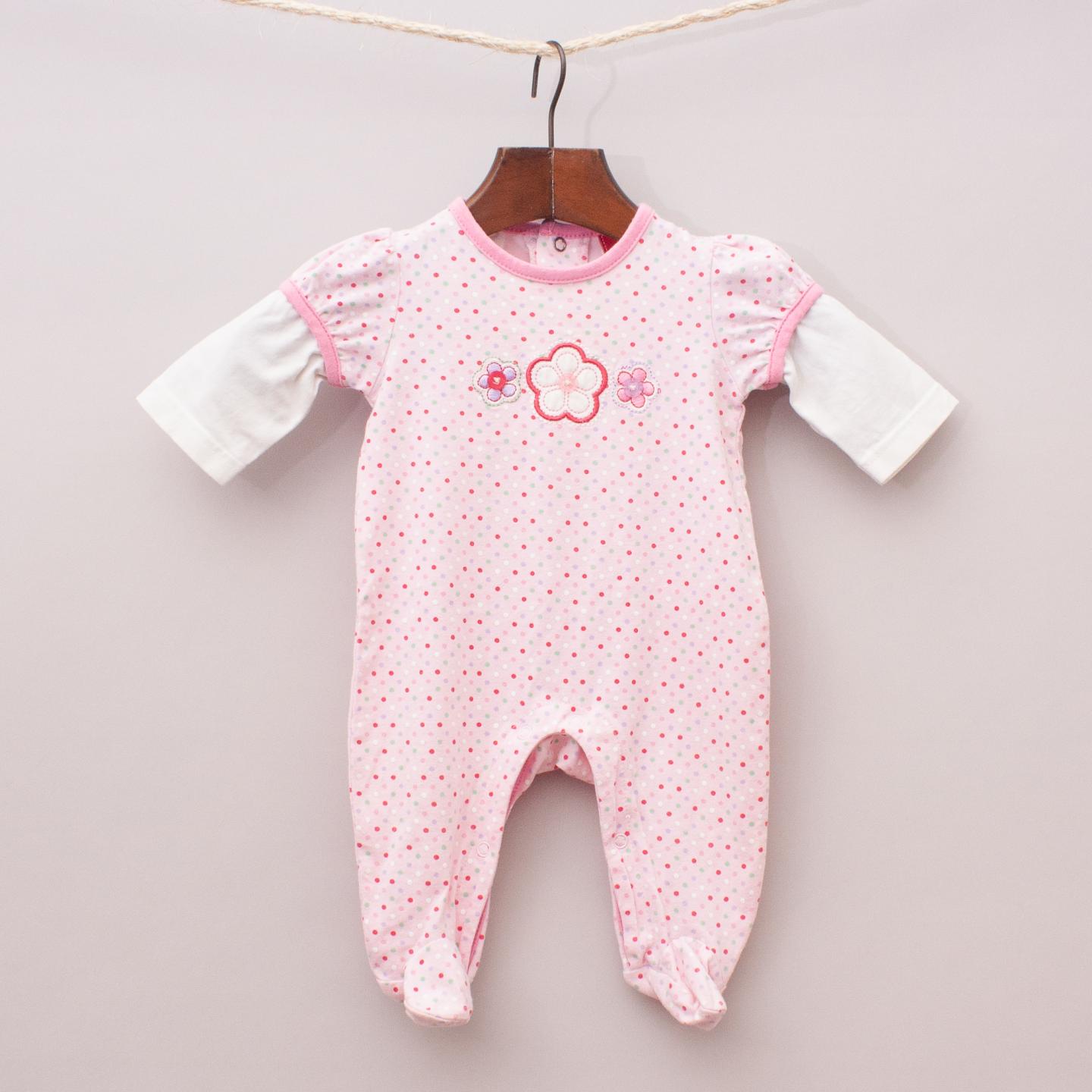Sprout pink polka dot patterned long sleeve romper with white sleeves, built in booties and button down back *Cotton/Elastane Blend