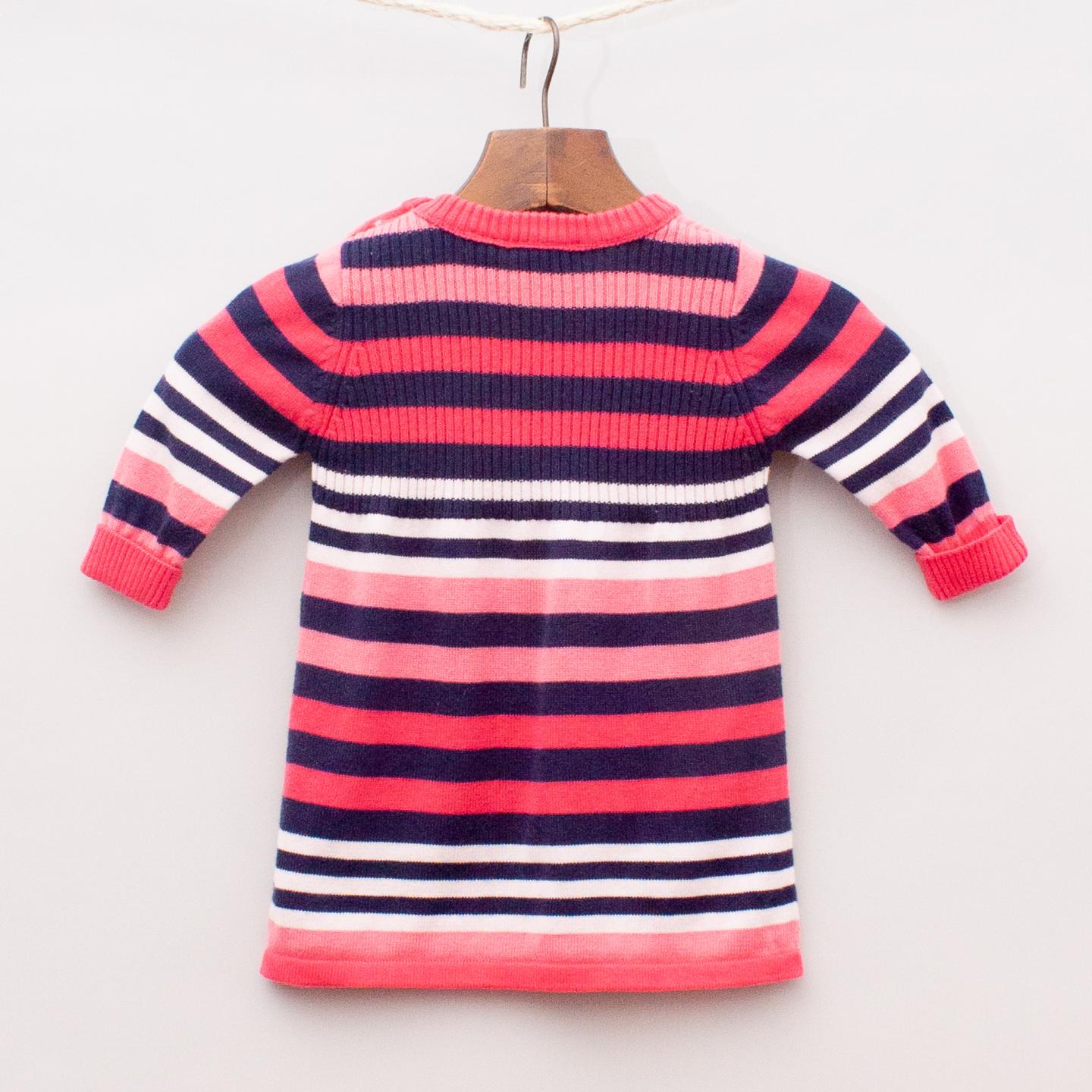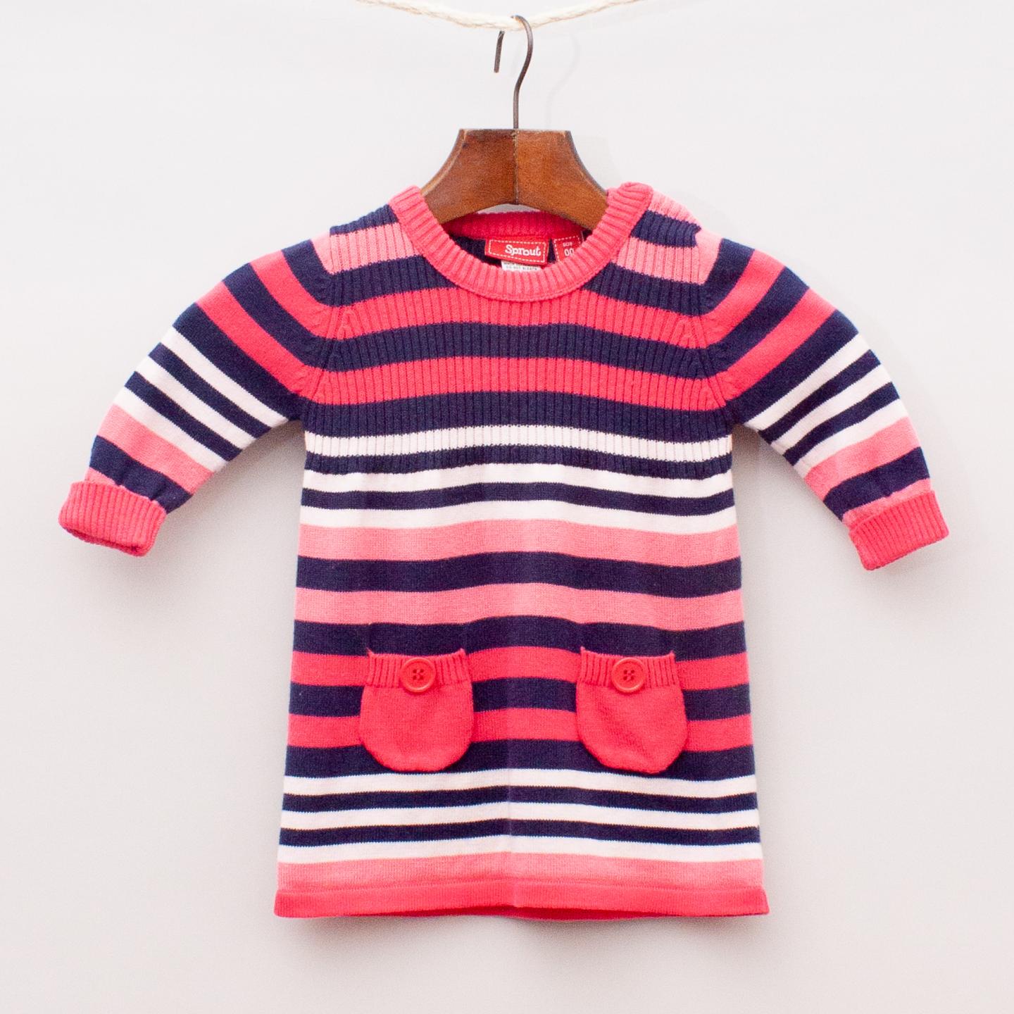 Sprout navy blue and pink toned striped dress with two front pockets, rolled cuffs and shoulder button closure