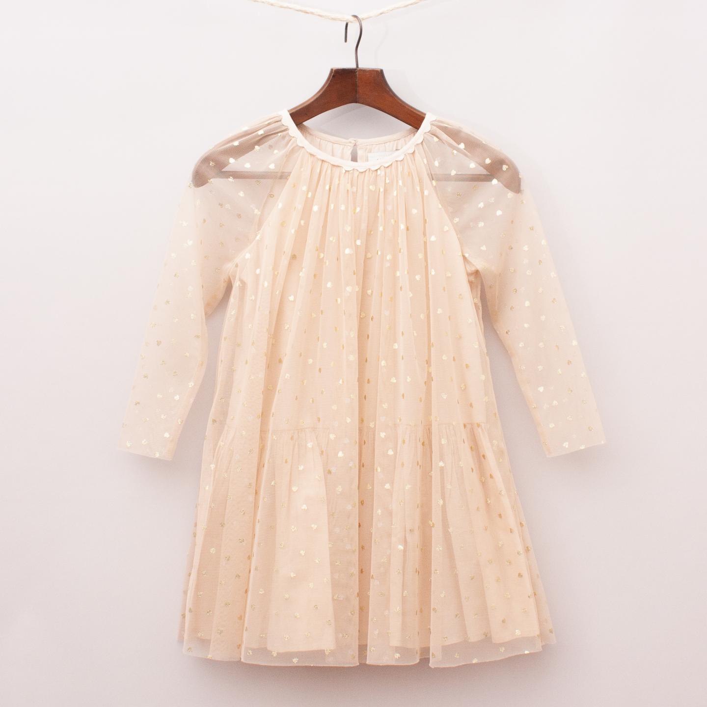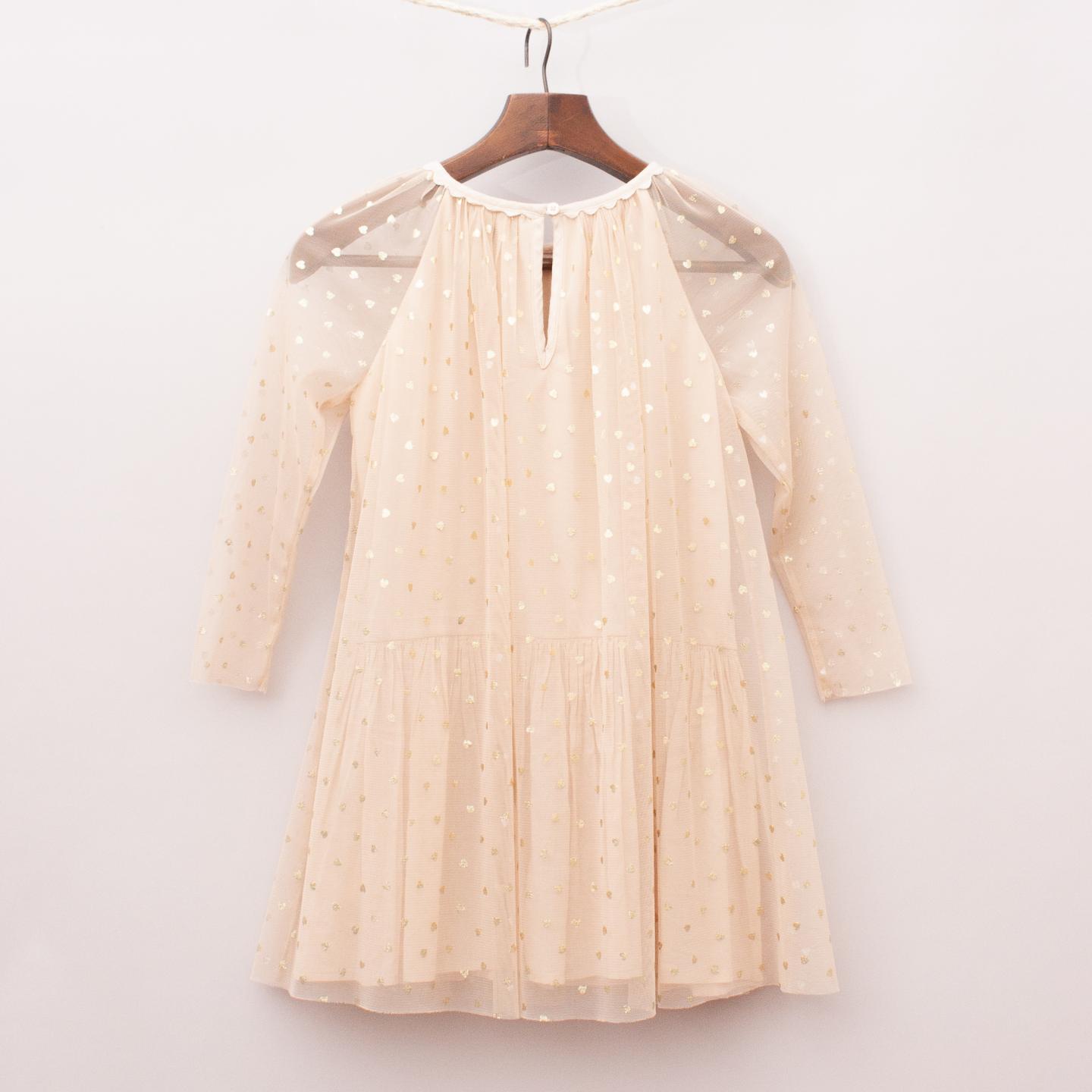 Stella McCartney light brown tulle long sleeve dress with gold heart pattern throughout, plain lining, gathered/floaty overlay and scalloped trim with single button back closure *100% Polyester Outer, 100% Cotton Inner