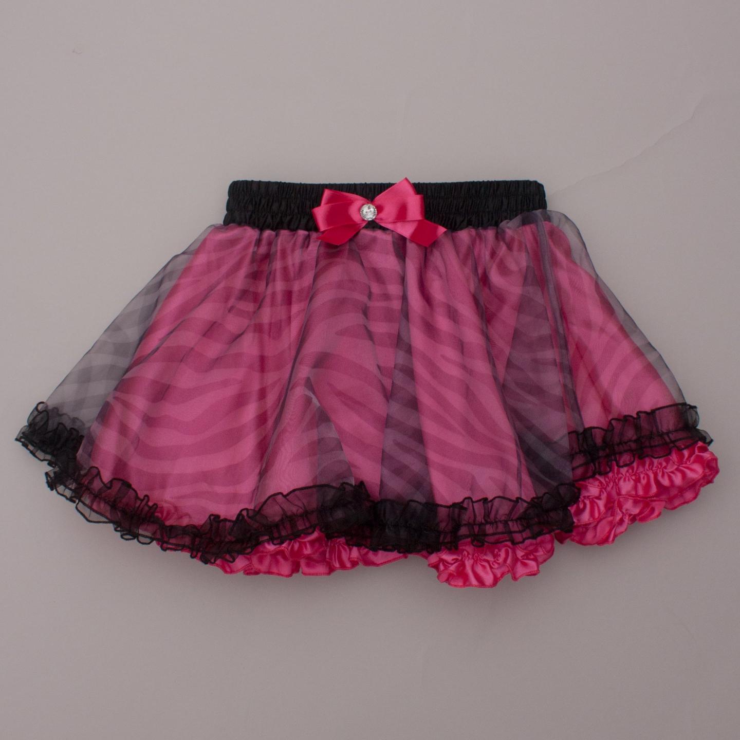 Stix n Stones hot pink satin full skirt with black sheer tiger striped layer, elastic waistband and diamante pink bow - Size 7