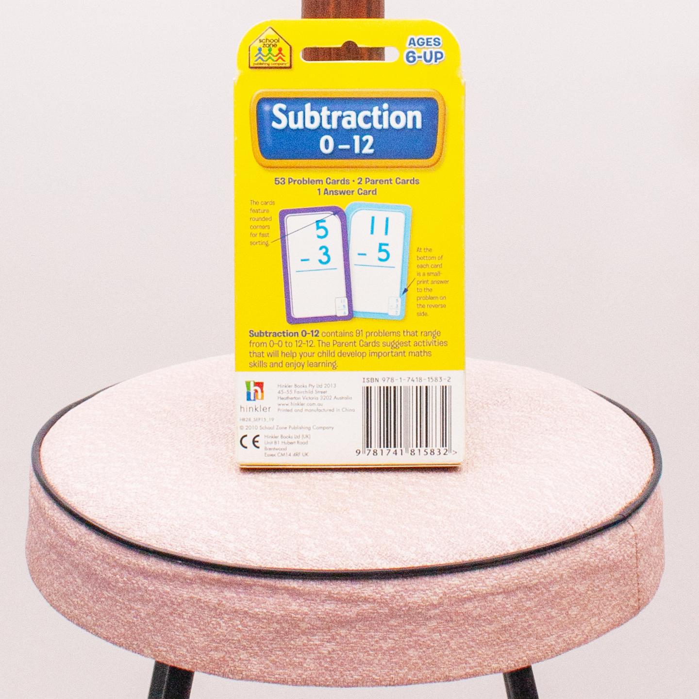 Subtraction flash cards 0-12, contains 53 problem cards, 2 parent cards and 1 answer card for ages 6 and up