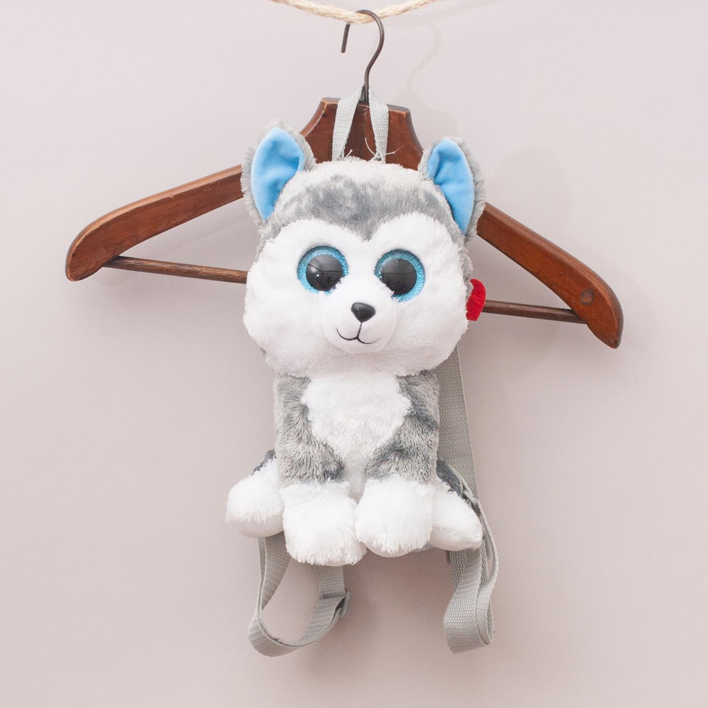 TY grey furry dog backpack with glittery eyes, single zip up compartment and adjustable straps