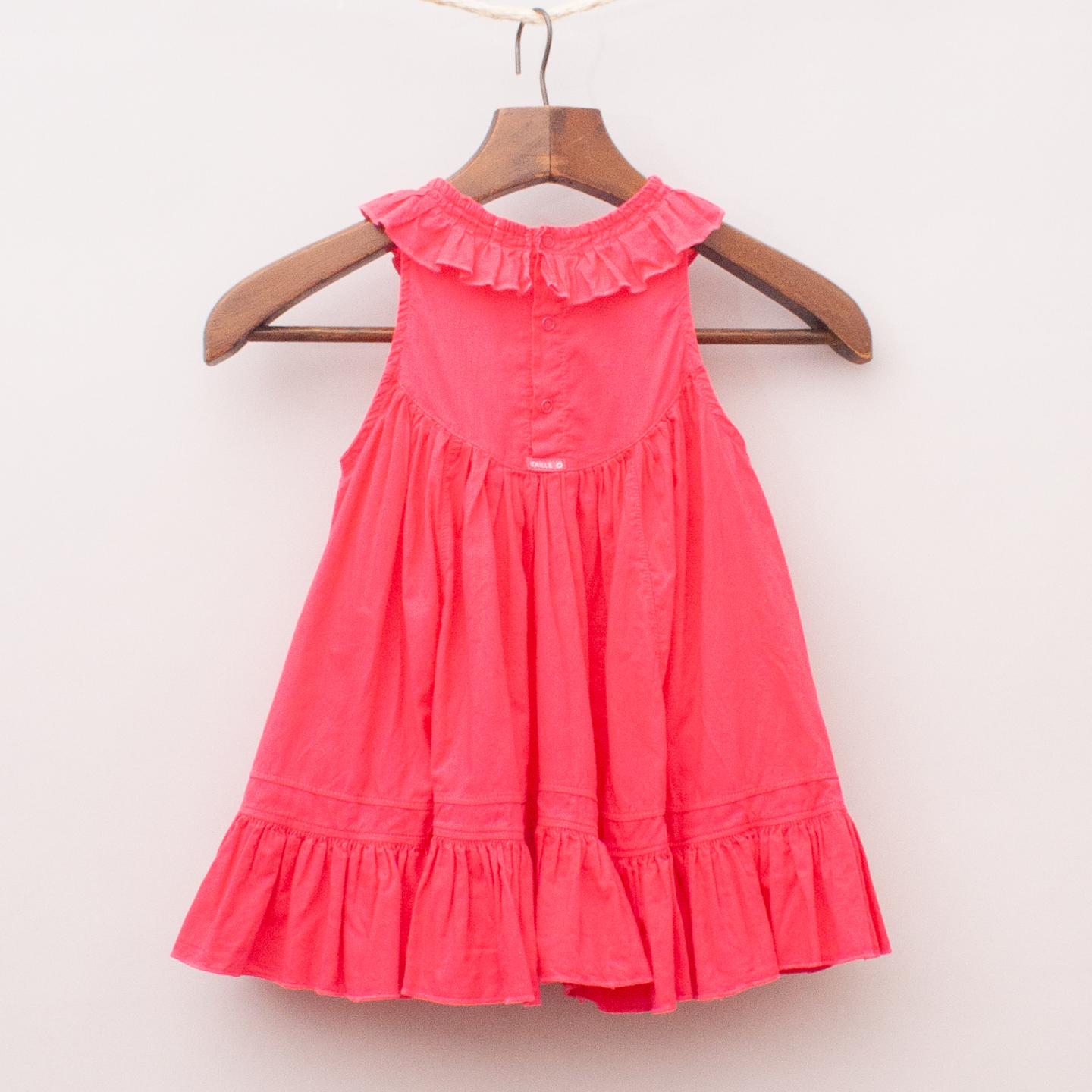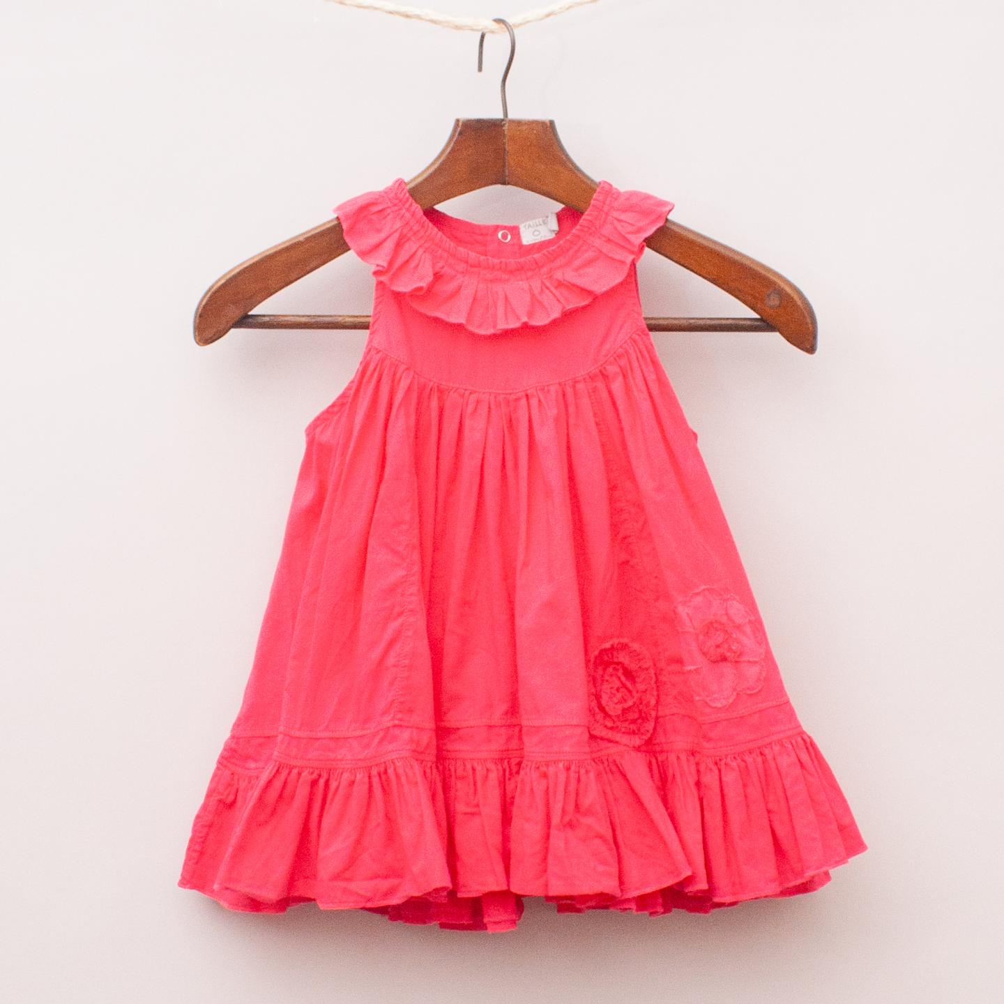 Taille hot pink dress with ruffled neckline and hemline, gathered front and embroidered flowers with button back closure *100% Cotton