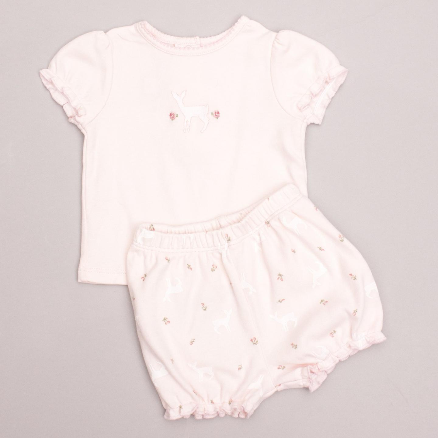 The Little White Company pastel pink top and bloomers set with embroidered reindeer on the front, puffed sleeves and printed matching bloomers with reindeer and flower print
