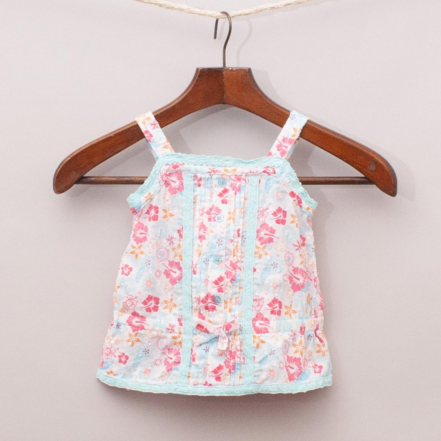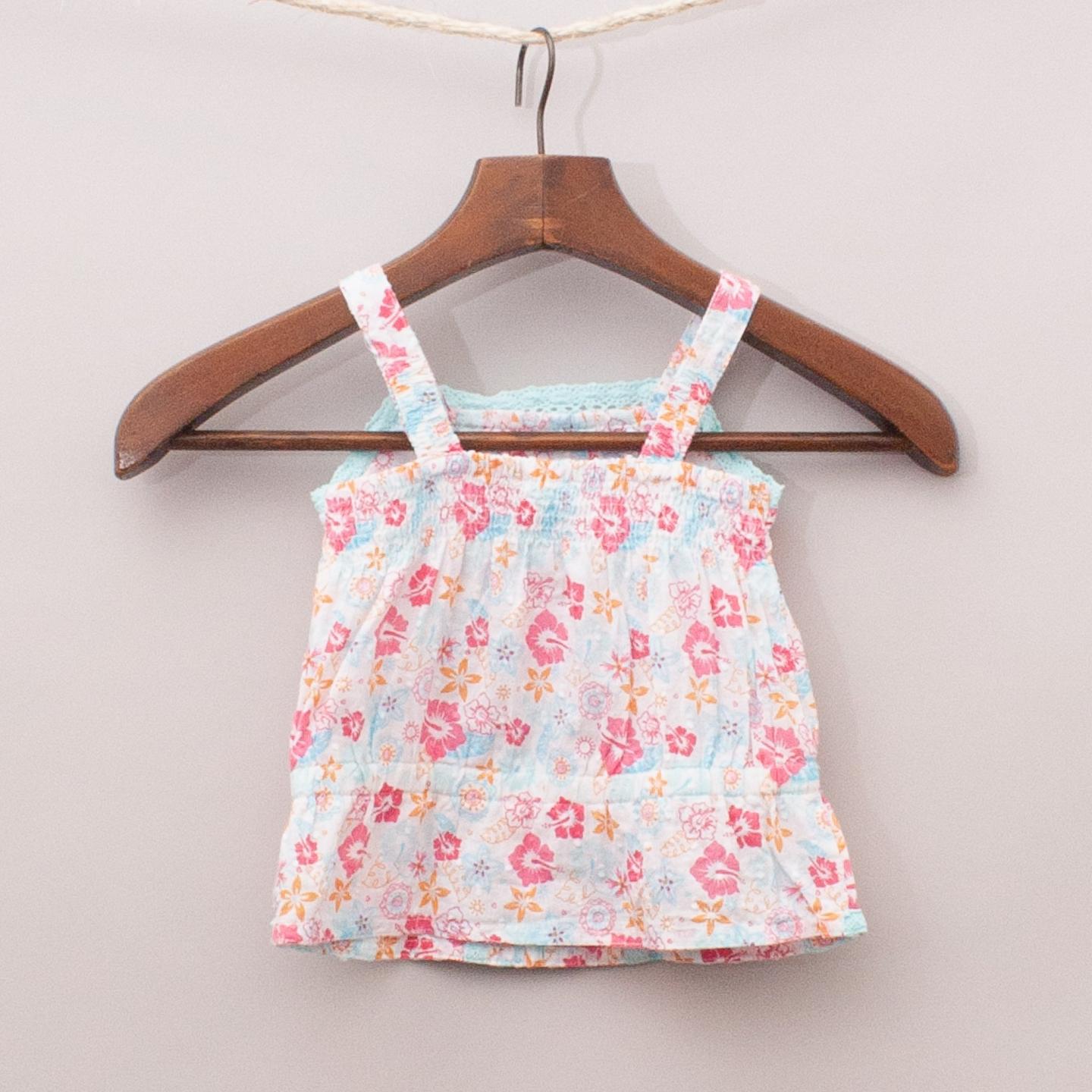 Tiny Little Wonders blue, pink and orange floral print top with pleated front, lace details and elastic waistband and straps