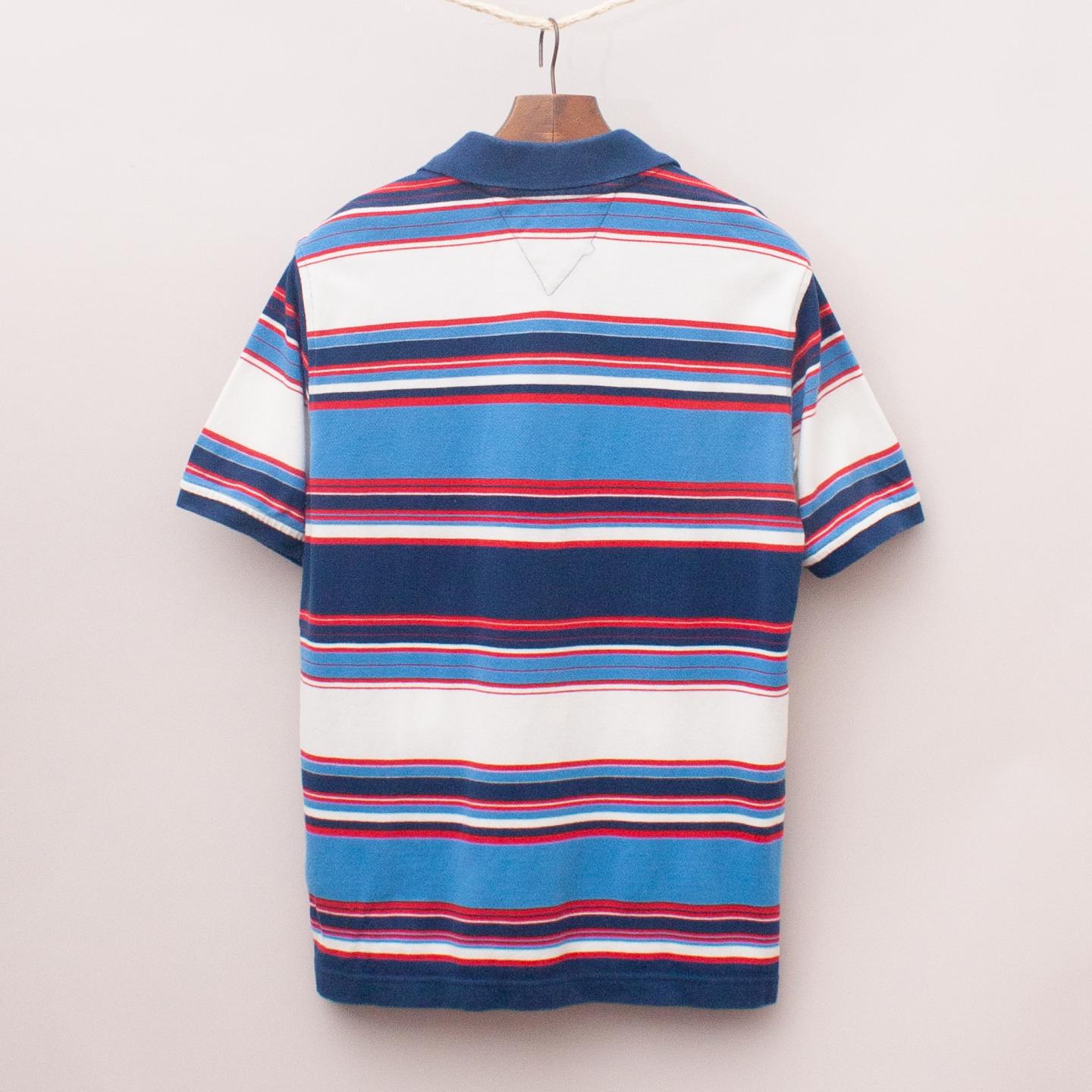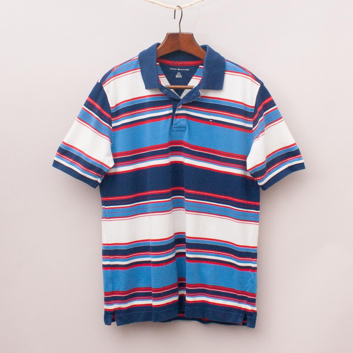Tommy Hilfiger blue, white and red short sleeve polo shirt with small embroidered logo and button down collar *100% Cotton
