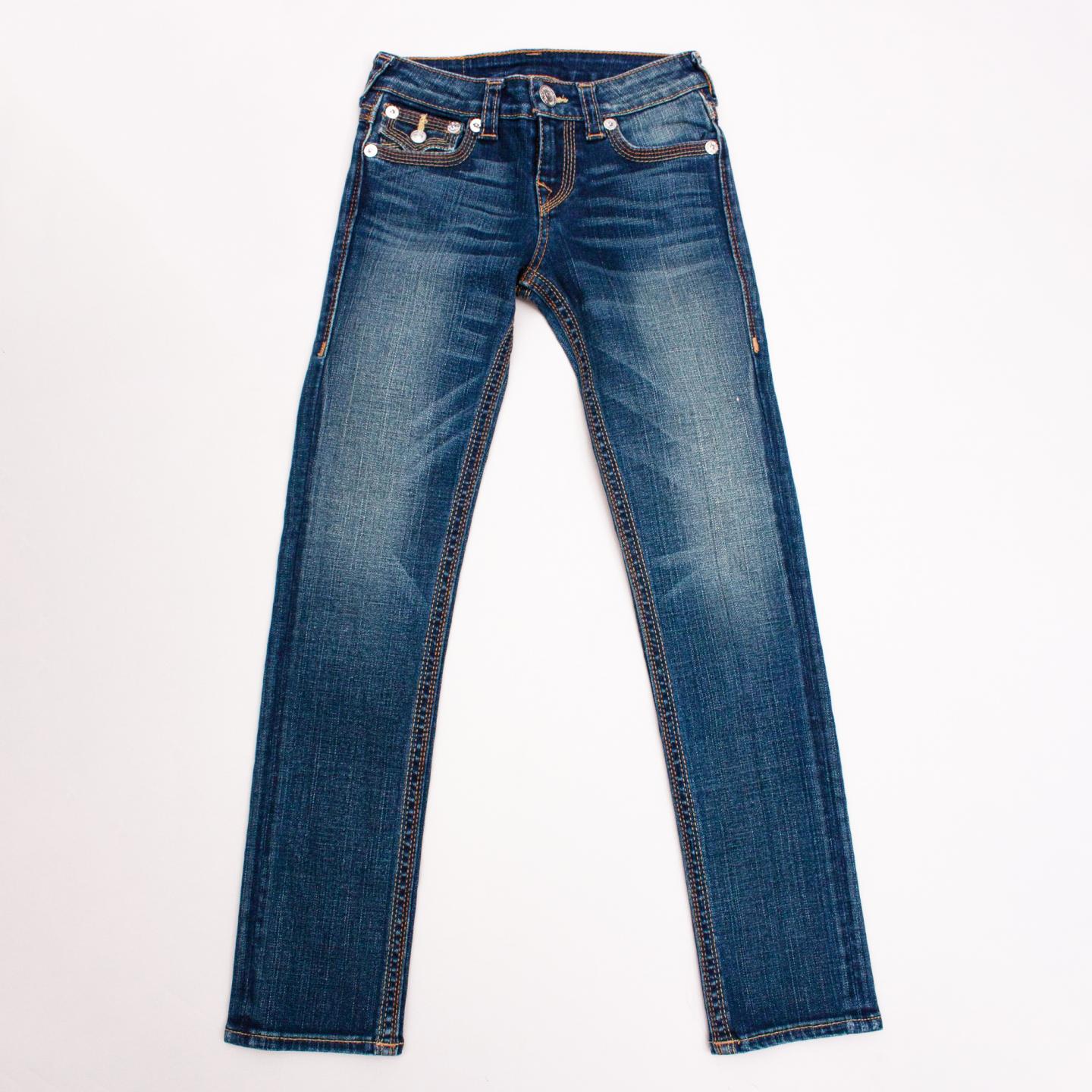 True Religion distressed skinny jeans with exposed stitching detail, front and back pockets, belt loops and button/zip fastening