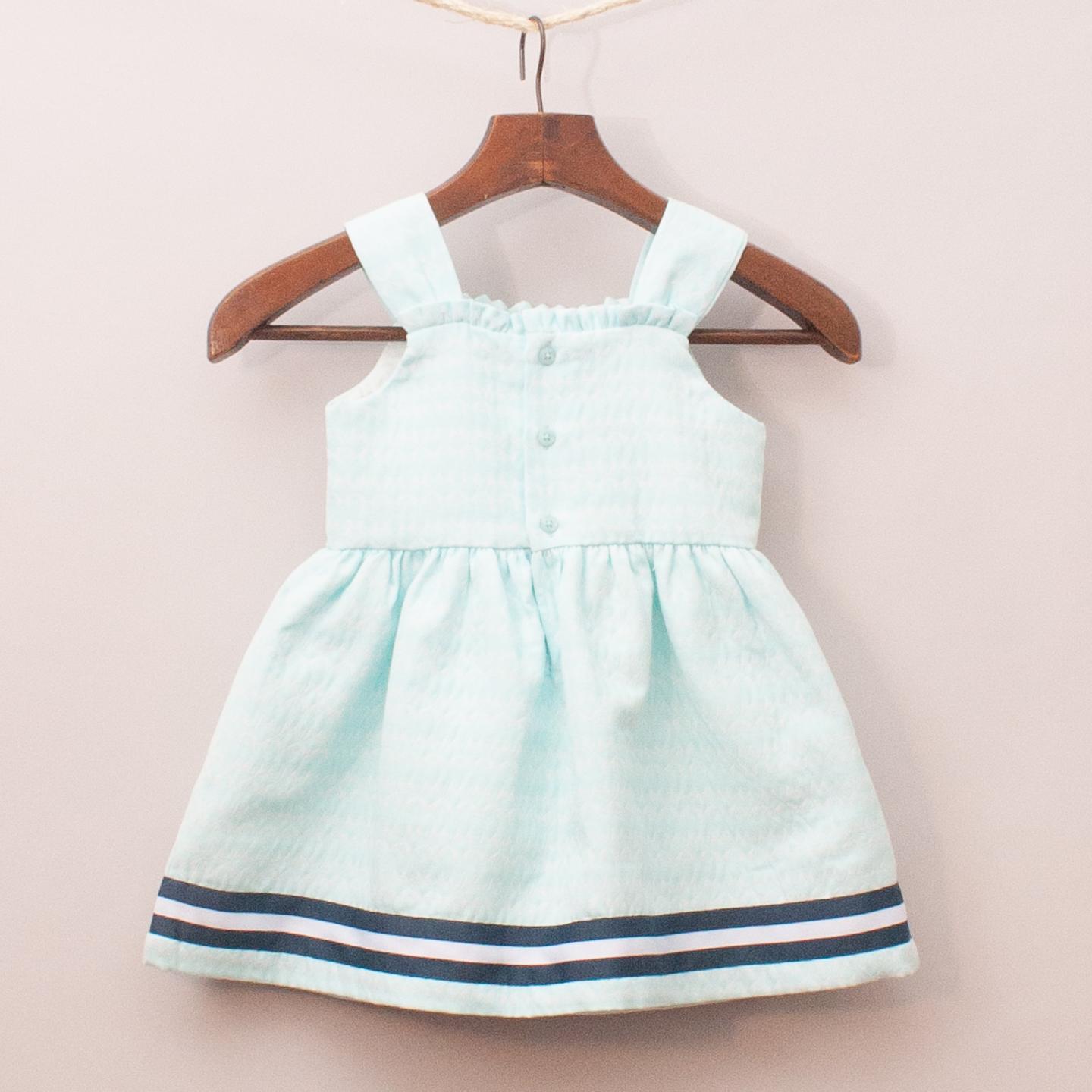 Tutto Piccolo "brand new with tags" pastel blue dress with full skirt, fitted bodice, stripe detail and button down back *50% Cotton, 50% Polyester