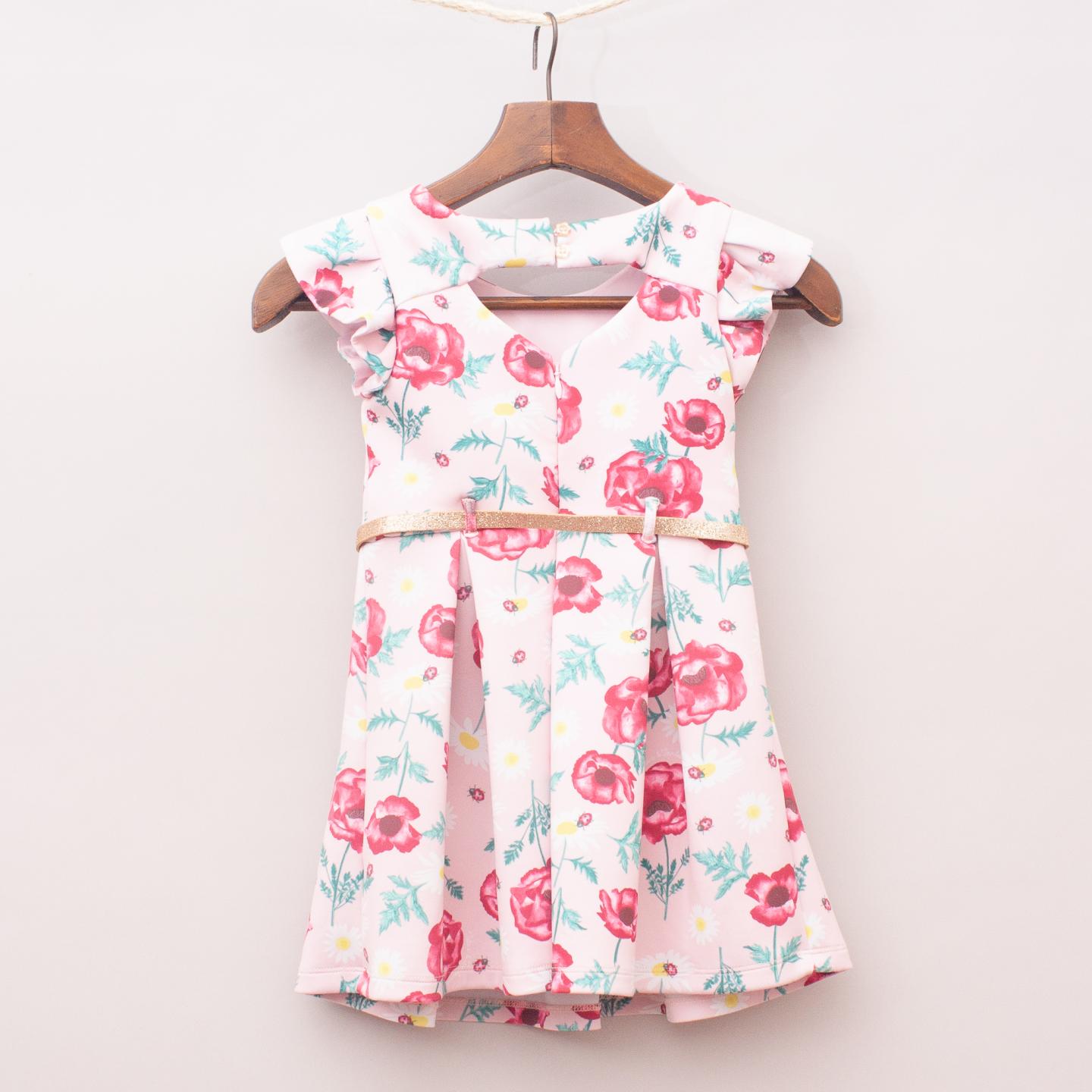 Tutu's & Tambourines pastel pink and rose patterned dress with pleated skirt, ruffle sleeves, attached belt with cut out back and button/zip fastening *Polyester & Elastane blend