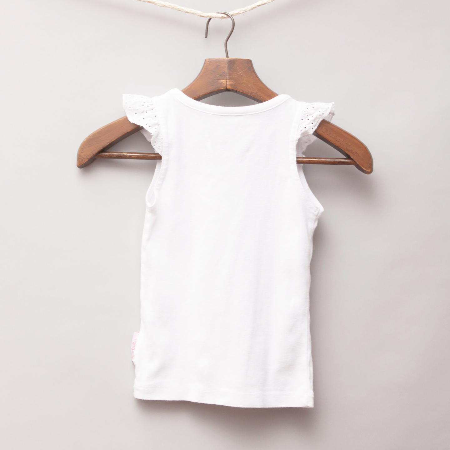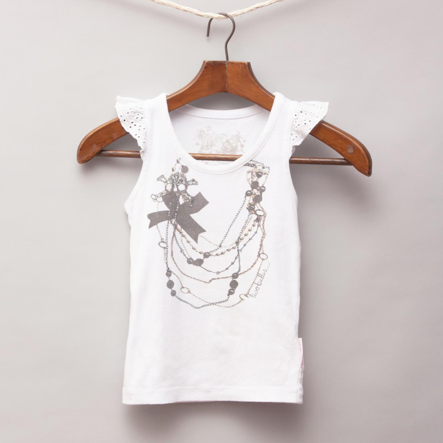 Two Belles white singlet with broderie anglaise sleeve trim with embellished necklace printed on front