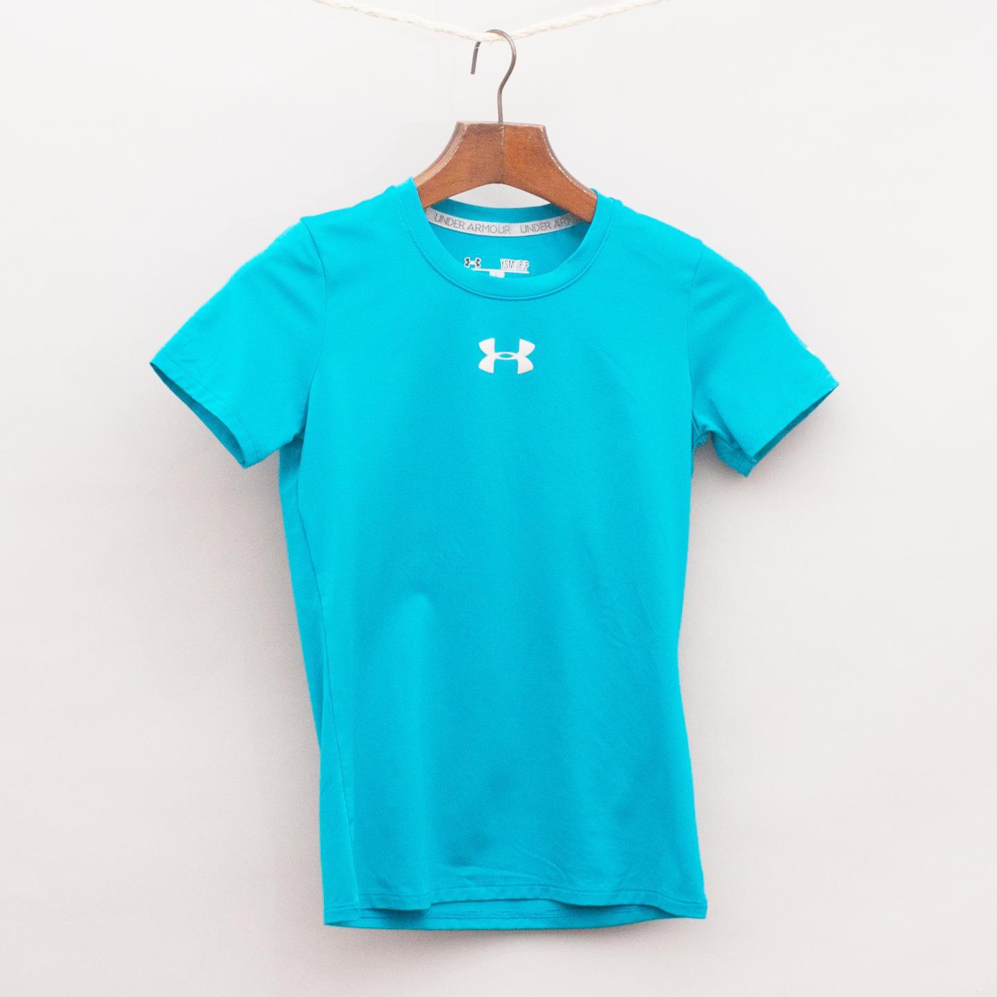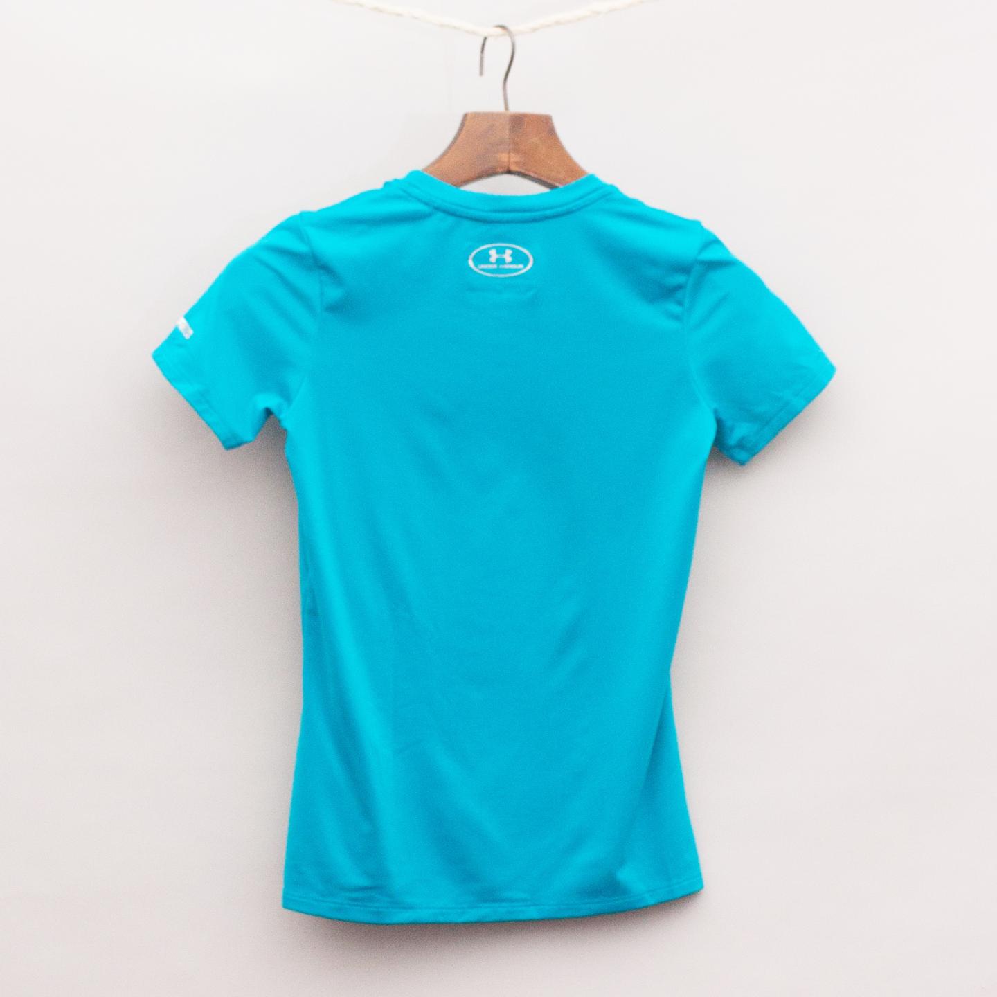 Under Armour bright aqua heat gear sports top with silver logo printed on the front