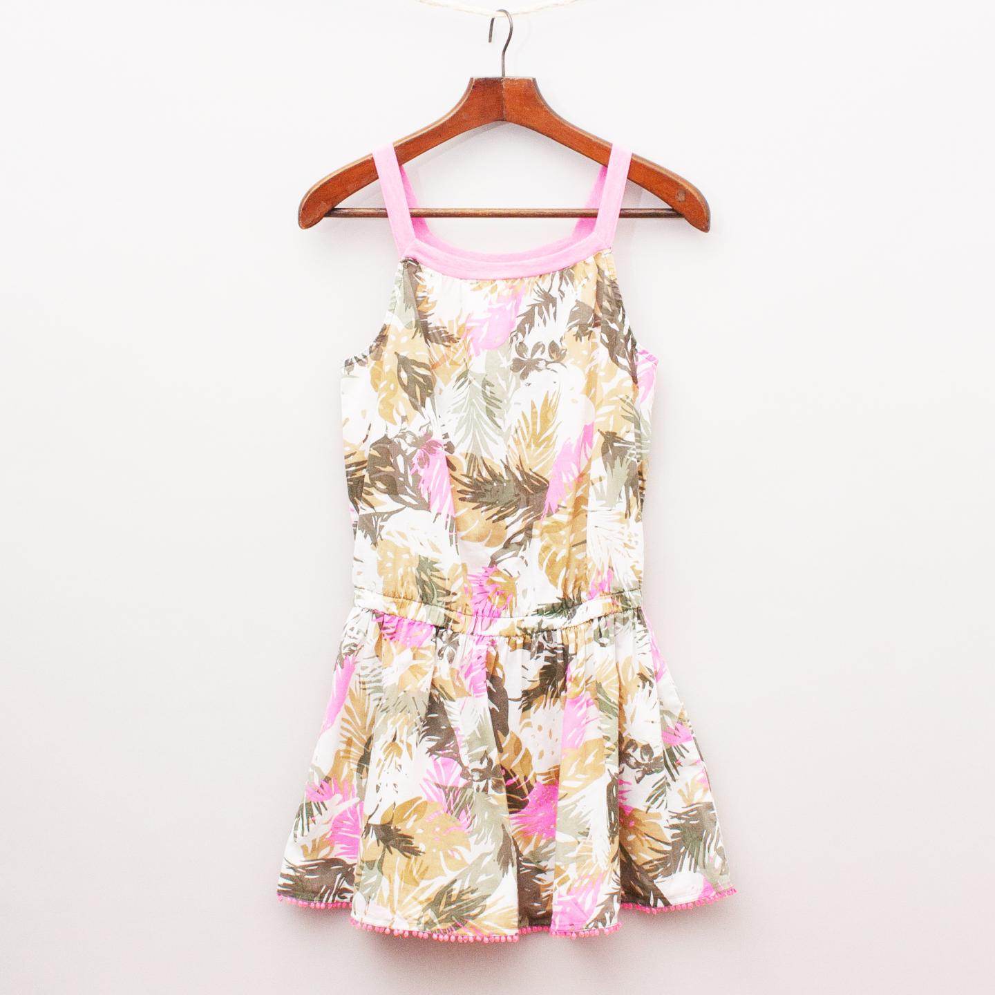 United Colours of Benetton leaf pattern dress with pink accents, elastic waistband and pom pom trim