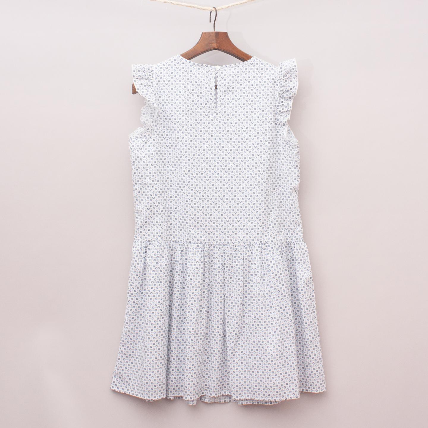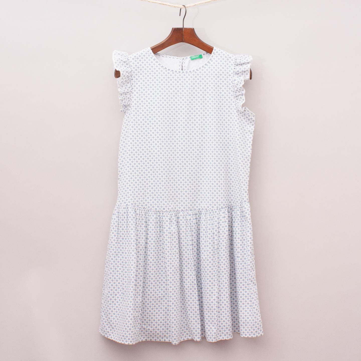 United Colours of Benetton white and blue patterned dress with ruffle sleeves, gathered skirt, fully lined with single button back closure *100% Cotton