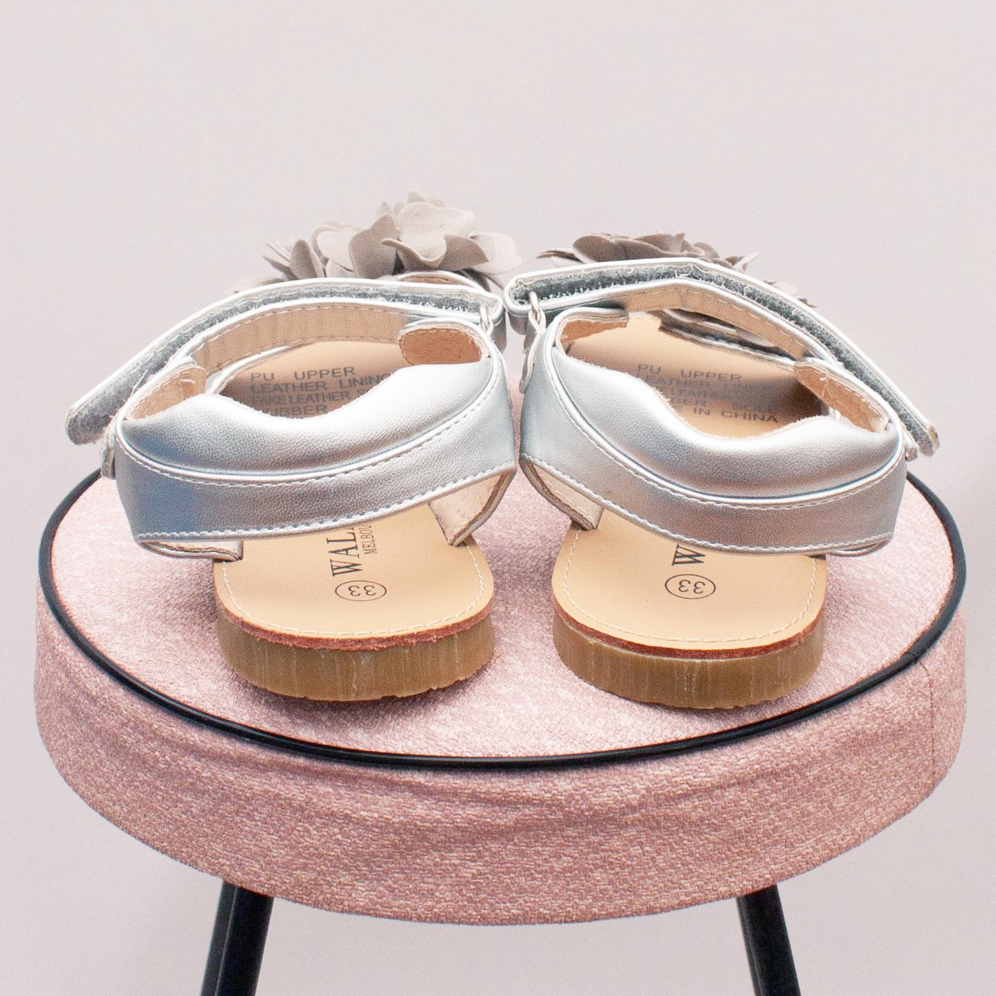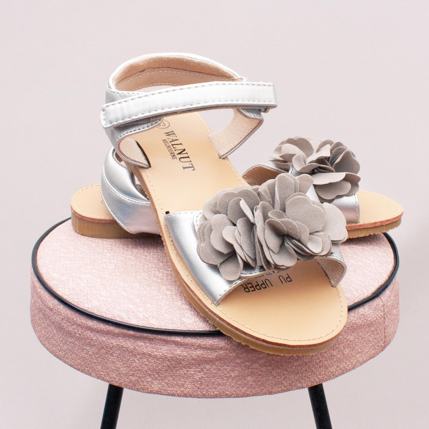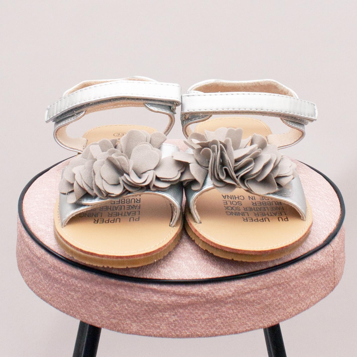 Walnut silver summer sandals with single velcro strap, fabric flower detail on the front and thin rubber soles - Size EU 33 (Age 6 approx.)