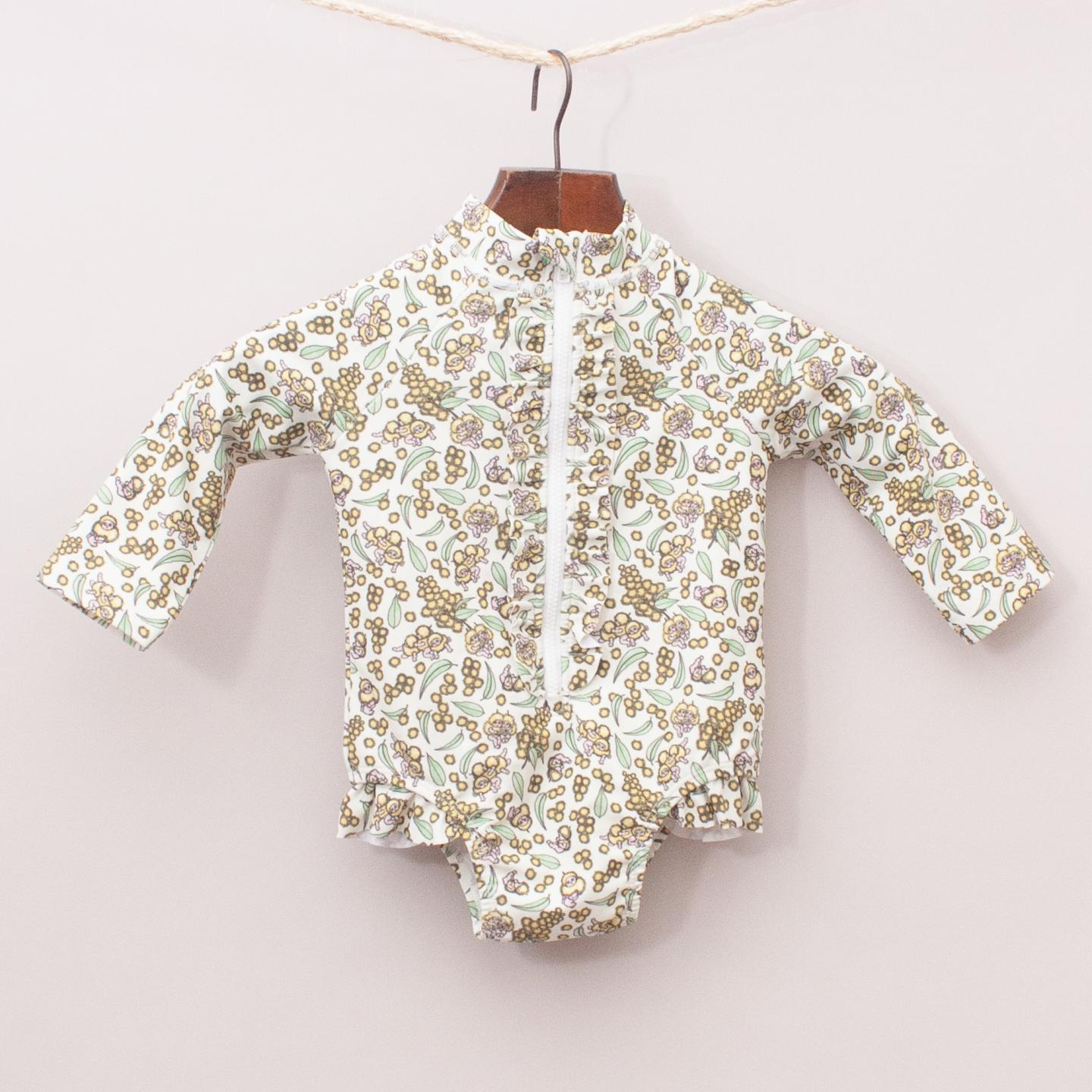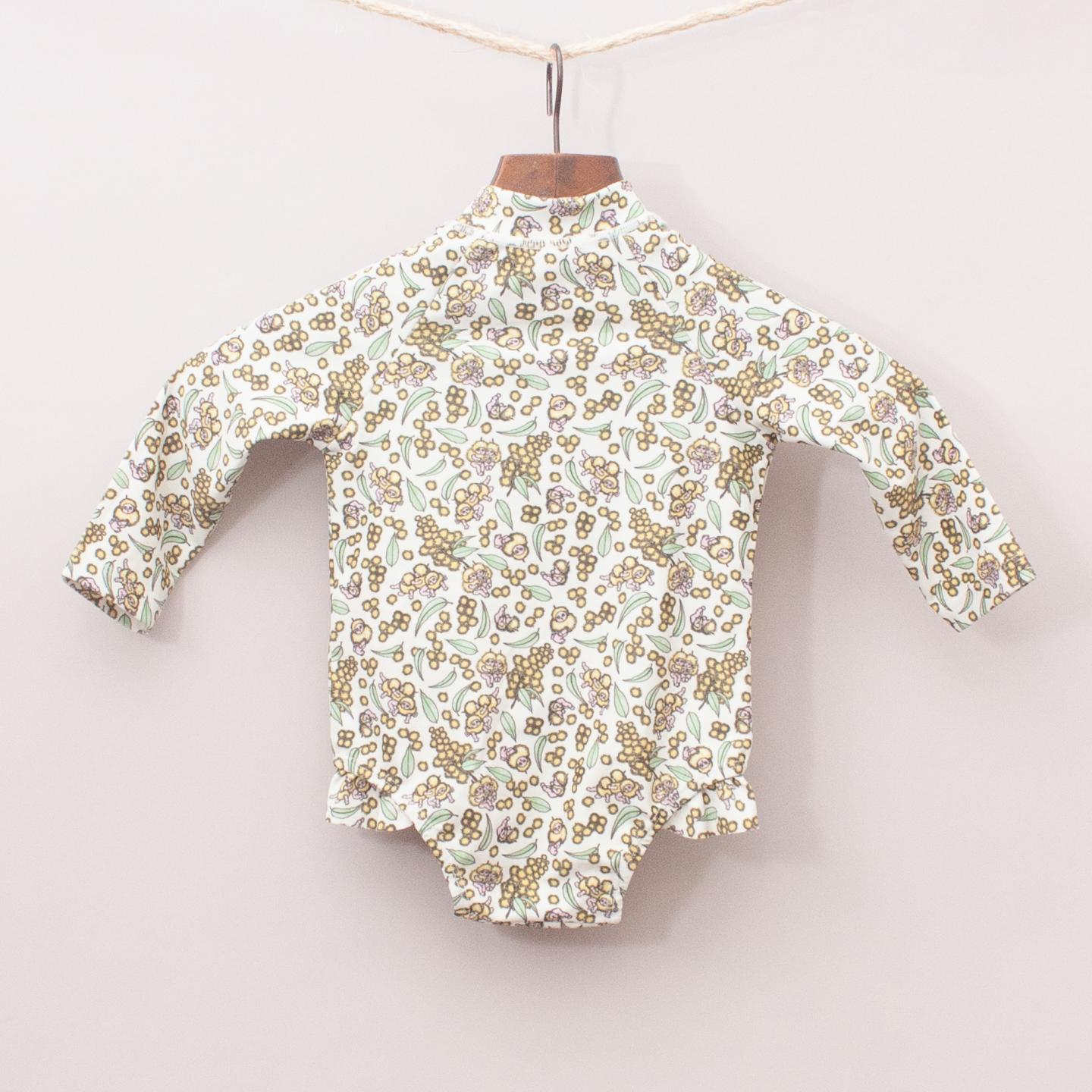 Walnut sage and wattle patterned long sleeve bathers with ruffle detail and zip front *82% Polyester, 18% Spandex
