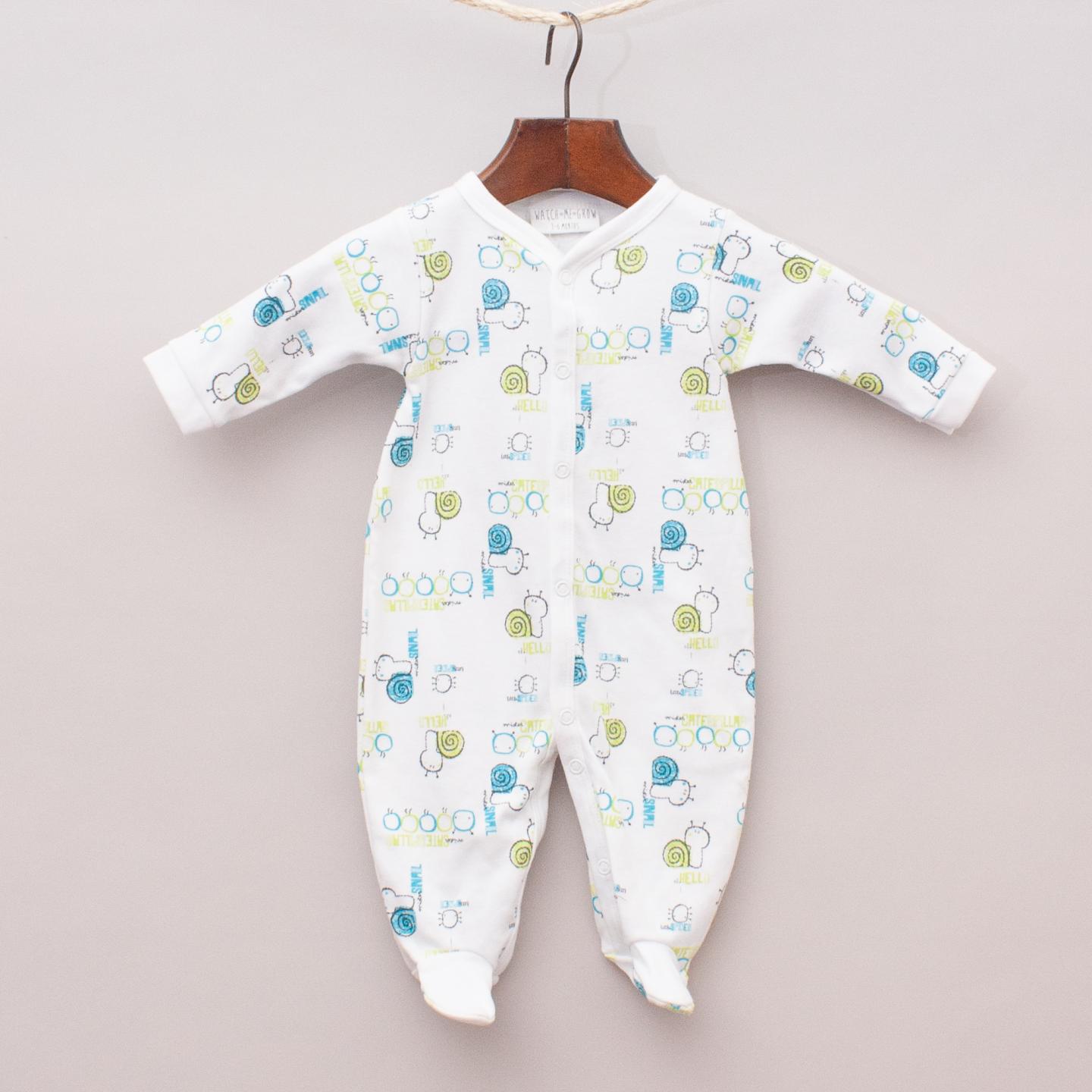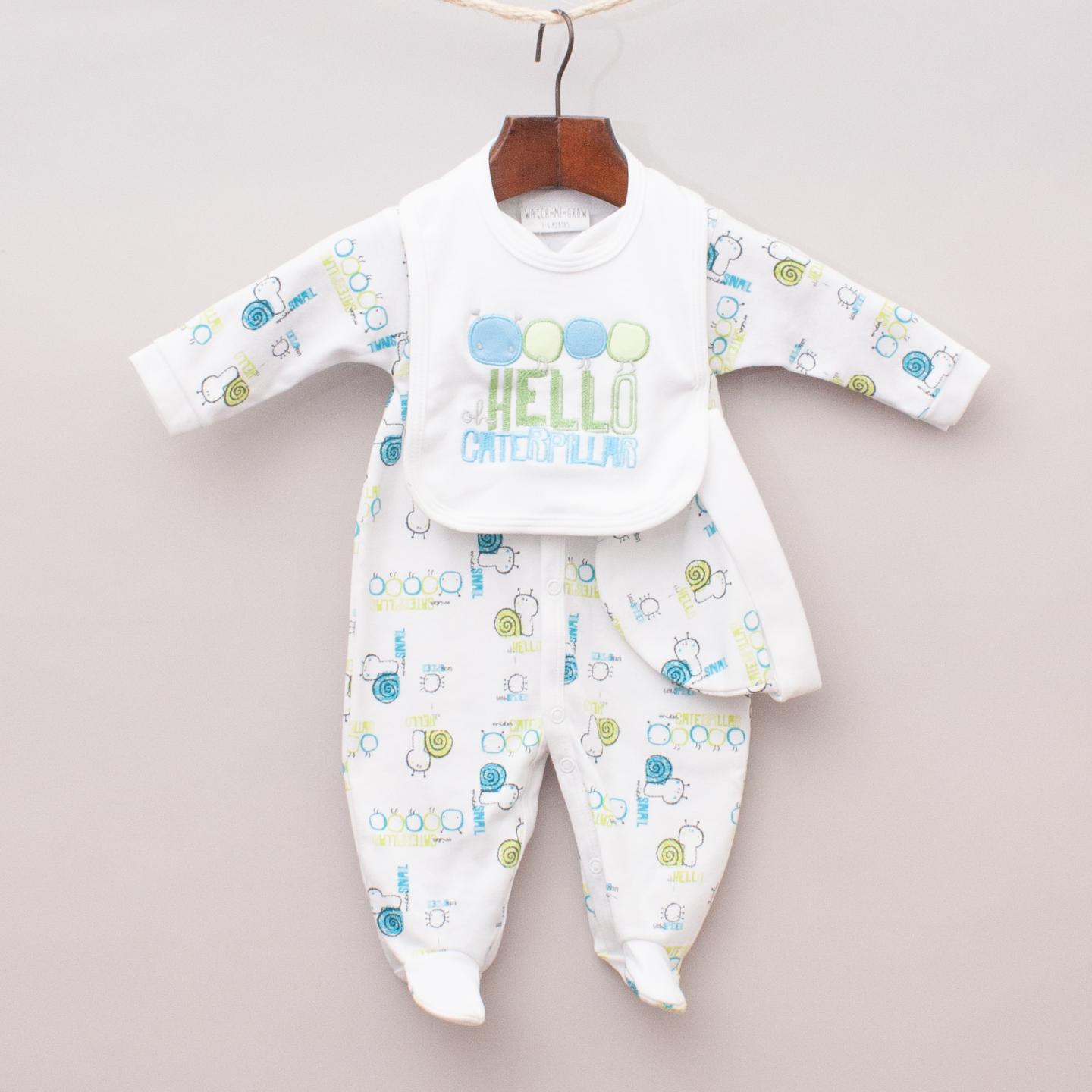 Watch Me Grow "brand new with tags" white and caterpillar patterned romper with matching bib and hat