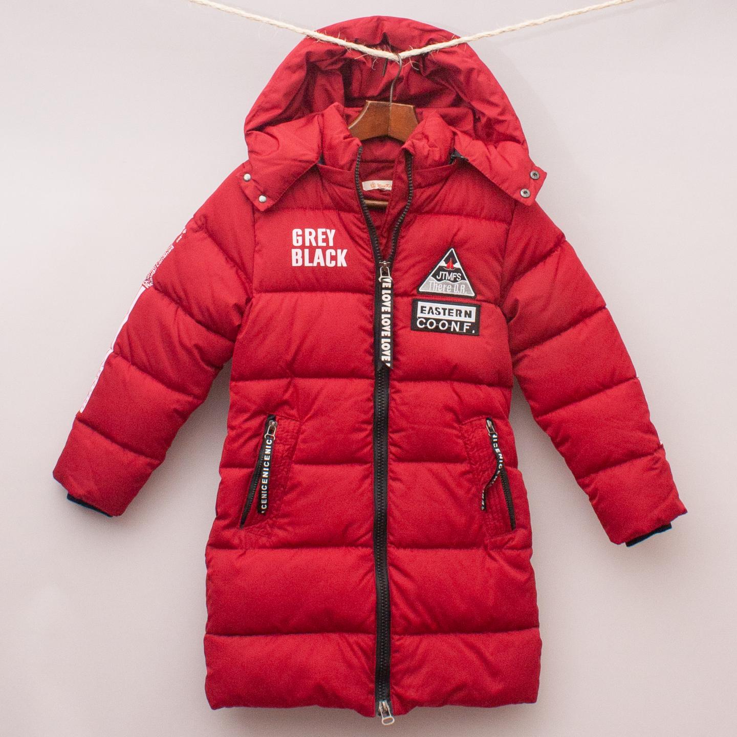 Wun Kia red padded coat with two front pockets, printed logo and patches throughout, detachable hood and full zip front - Very Warm