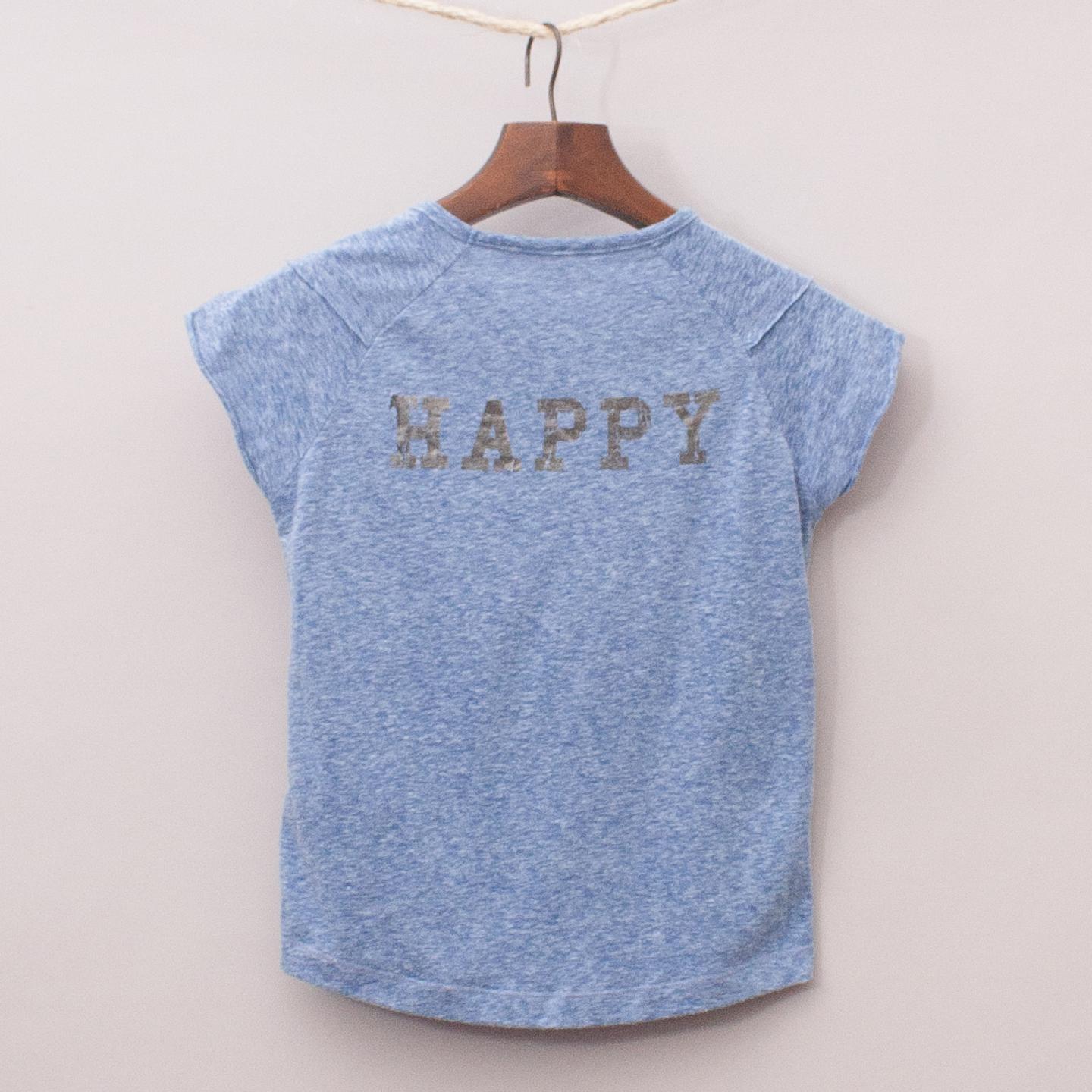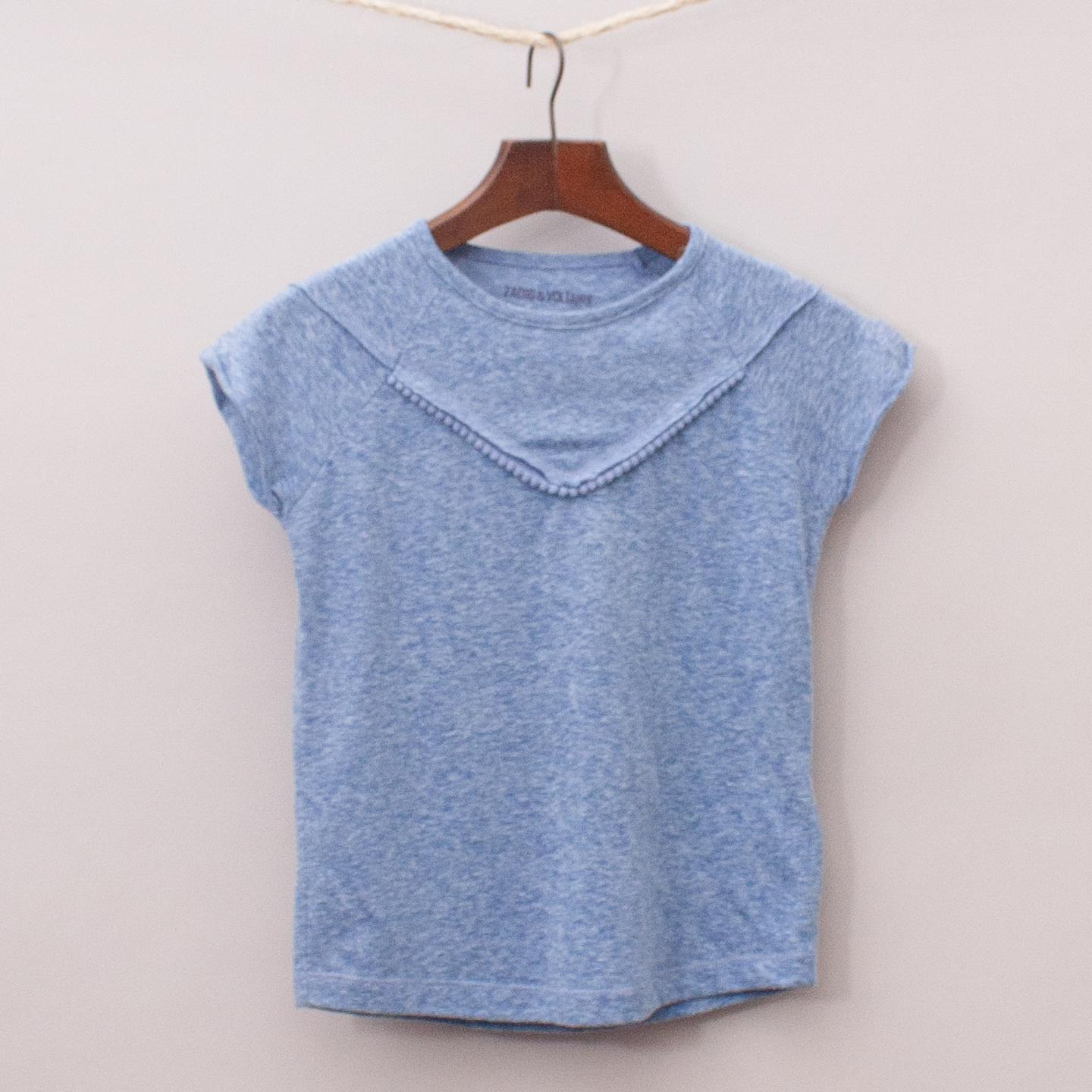 Zadig & Voltaire blue marle t-shirt with pom pom trim across the front, printed 'happy' on the back and cap sleeves *65% Polyester, 35% Cotton