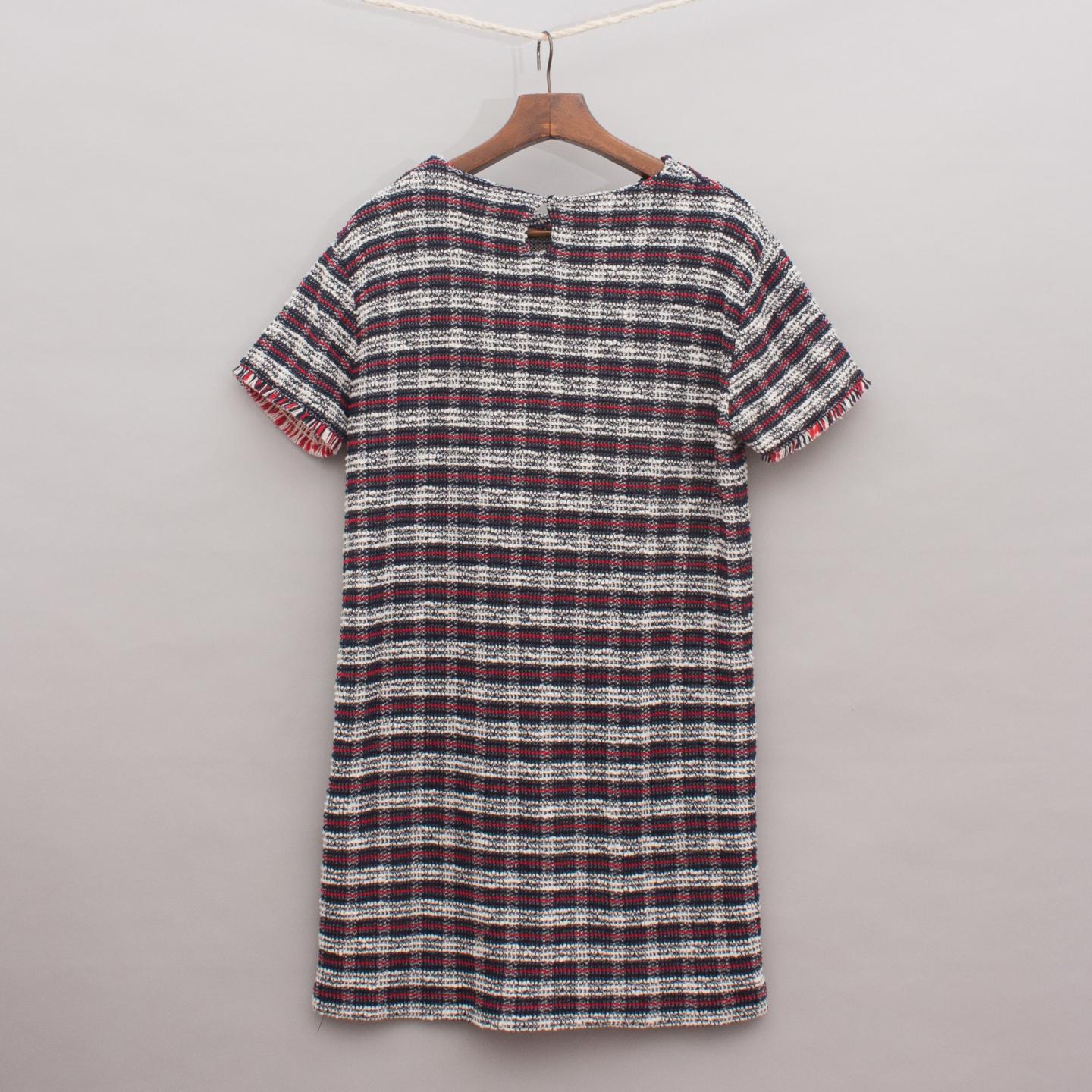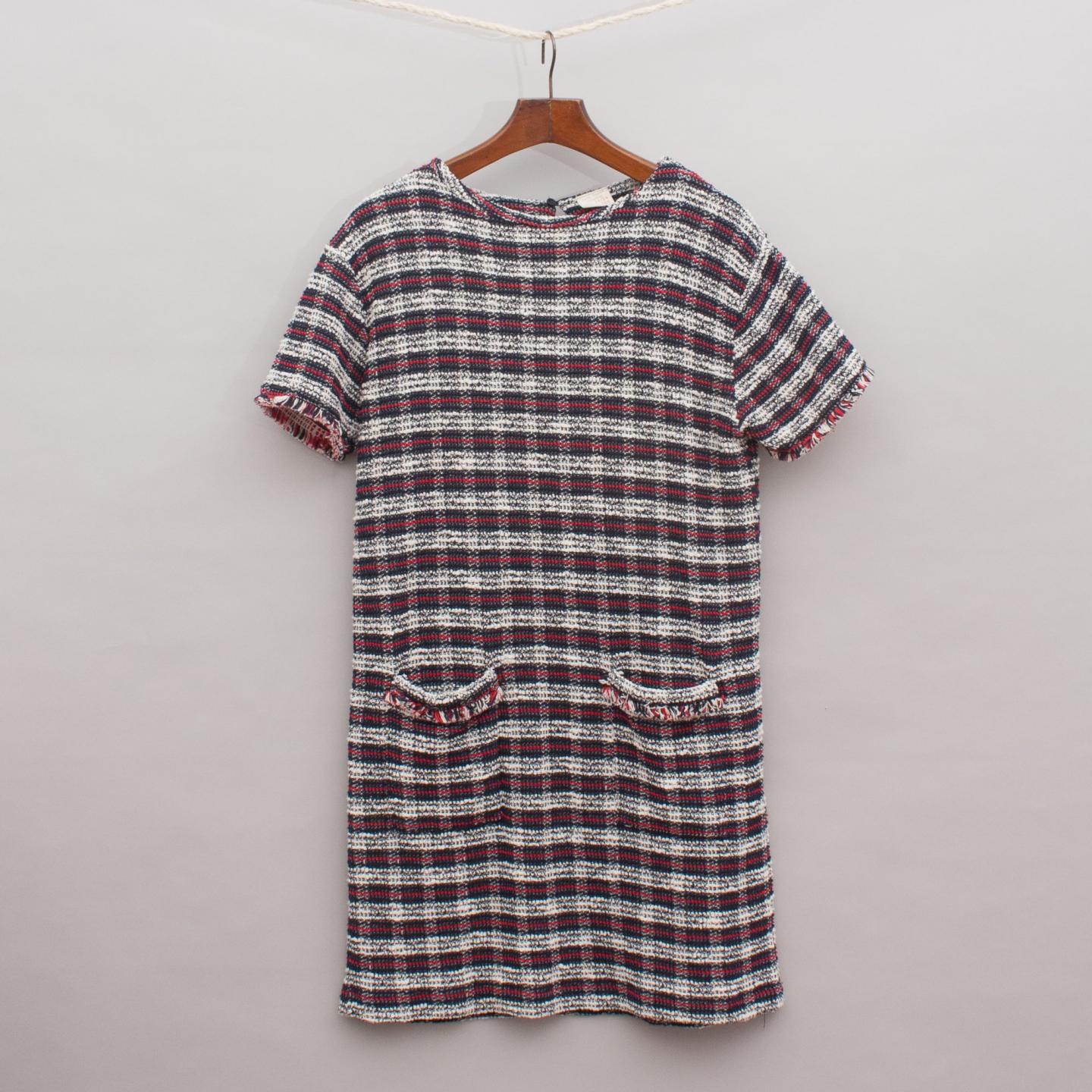 Zara 'chanel-esque' style short sleeve dress with two front pockets, wide neckline, frayed edges and single button back closure