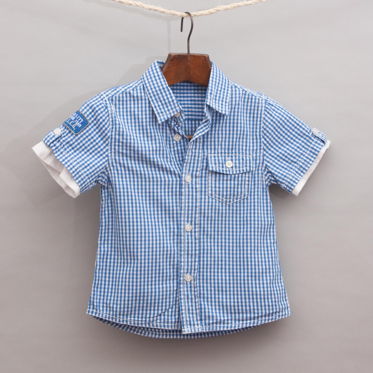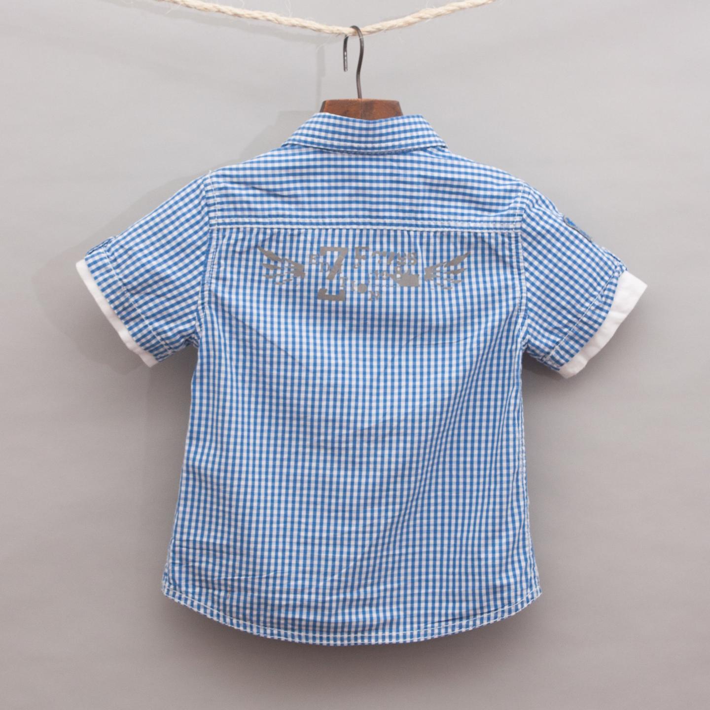 Zara blue and white checked short sleeve shirt with single front pocket, white t-shirt underlayer, embroidered patch on the sleeve and full button down front