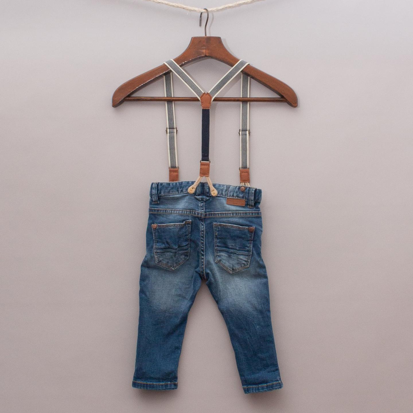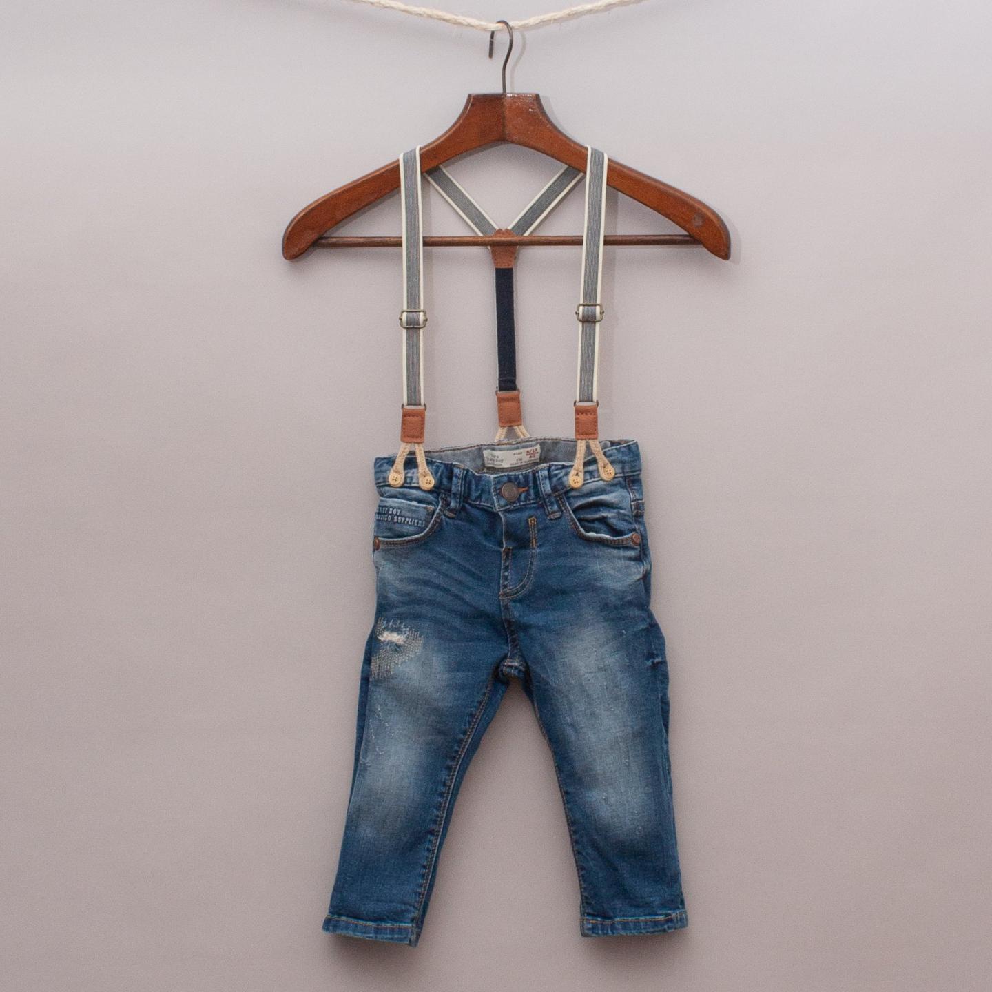 Zara blue distressed jeans with front and back pockets, belt loops, button closure and detachable suspenders
