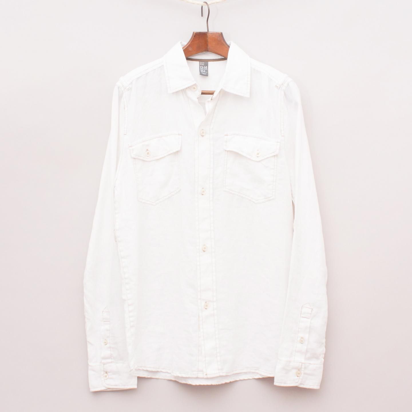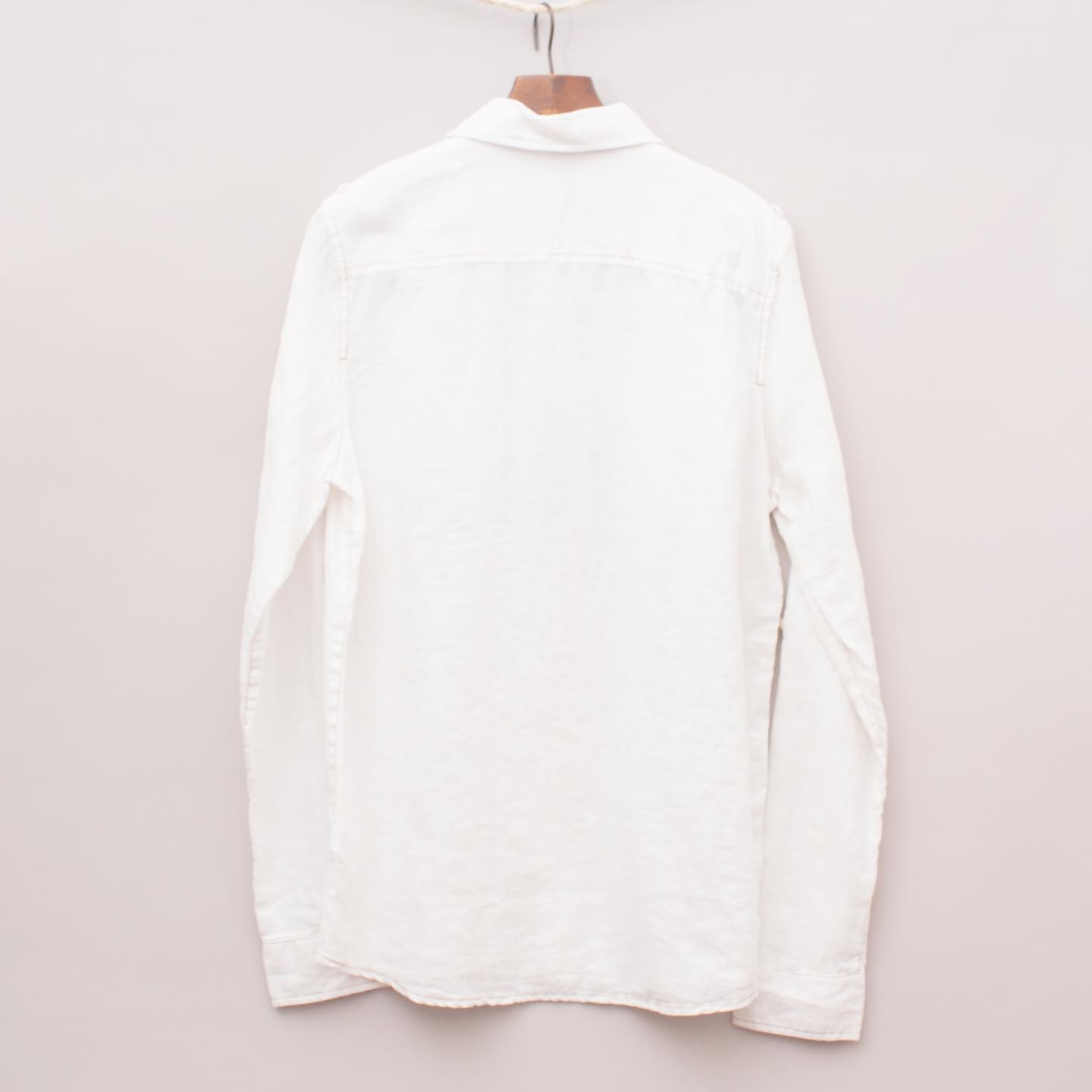 Zara white linen long sleeve shirt with two front pockets, exposed beige stitching detail and full button down front