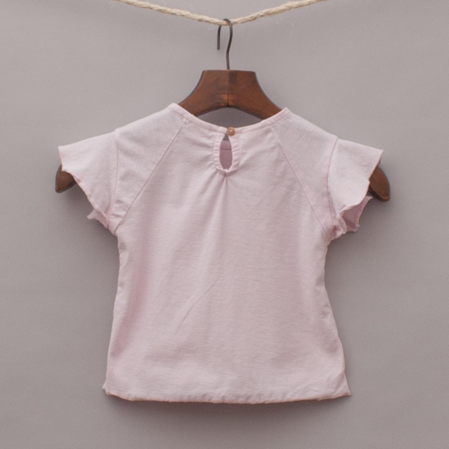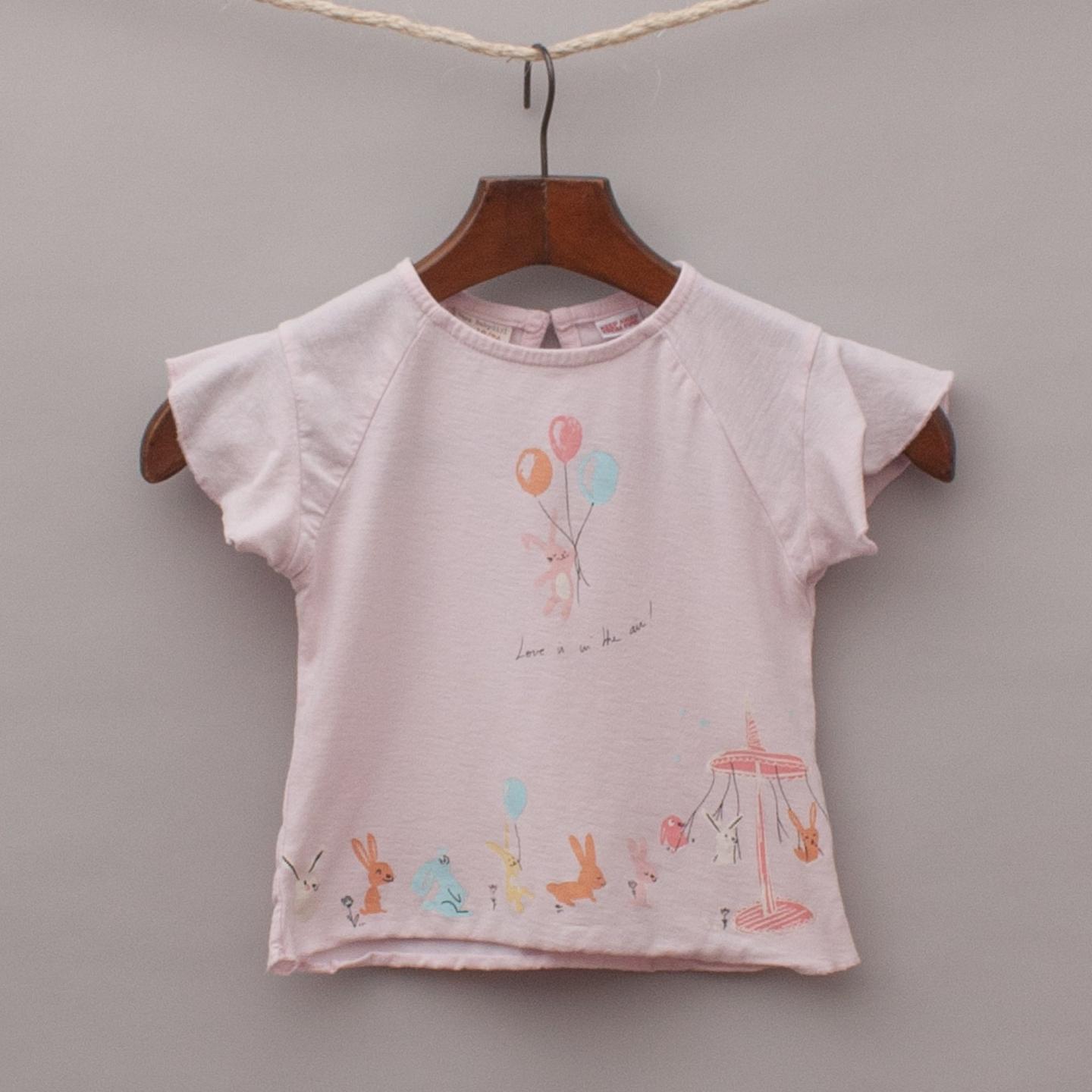 Zara pastel pink t-shirt with playful rabbits printed throughout, flutter sleeves and single button back closure