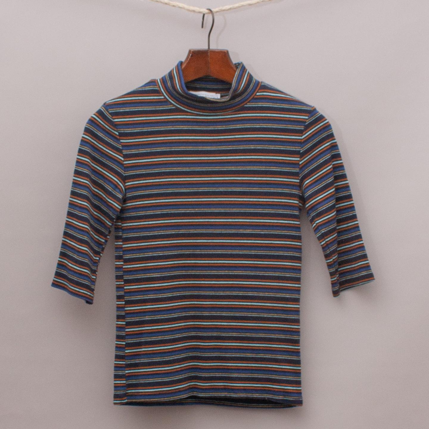Zara multi coloured striped fitted top with 3/4 sleeves and high neck collar