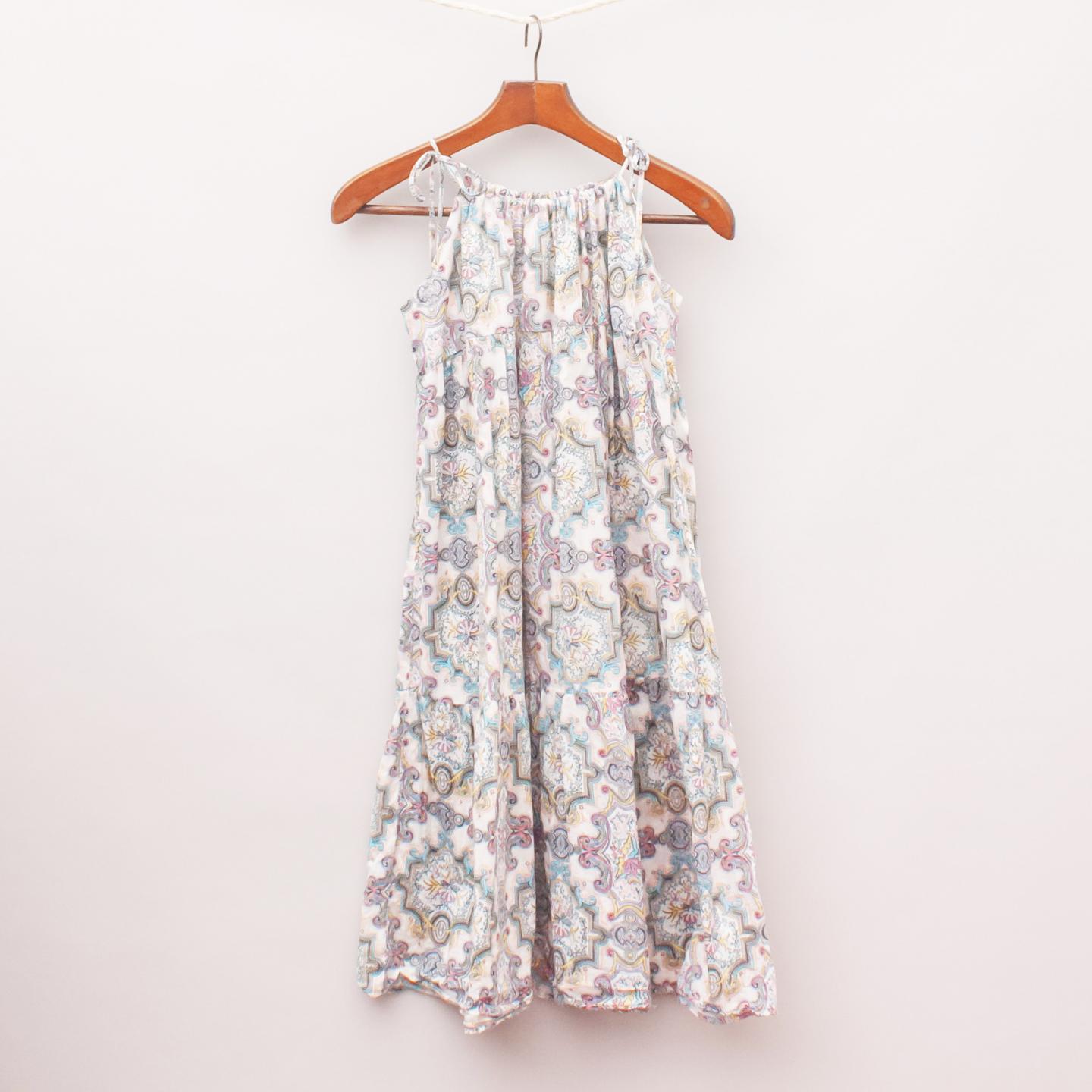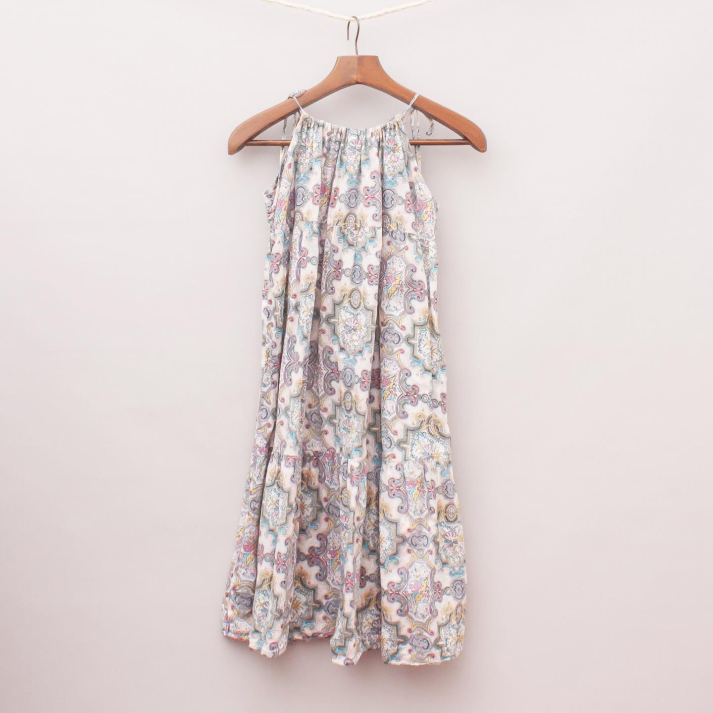 Zimmerman pastel toned paisley print dress with wide ruffled hemline and adjustable and tie up straps with gathered neckline